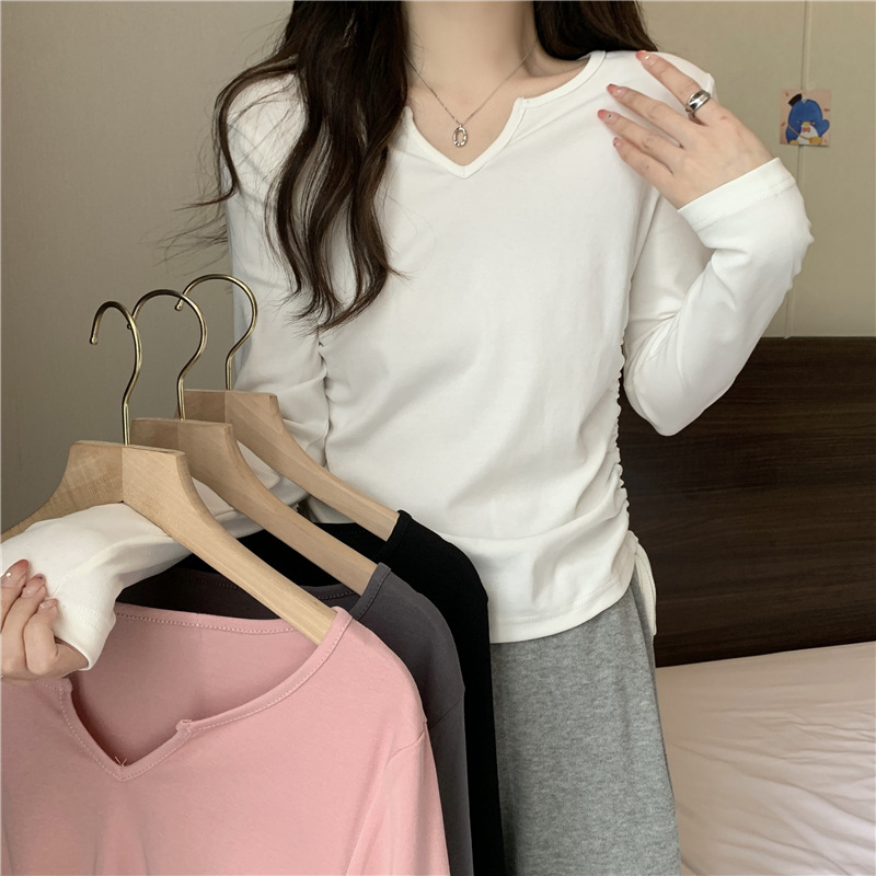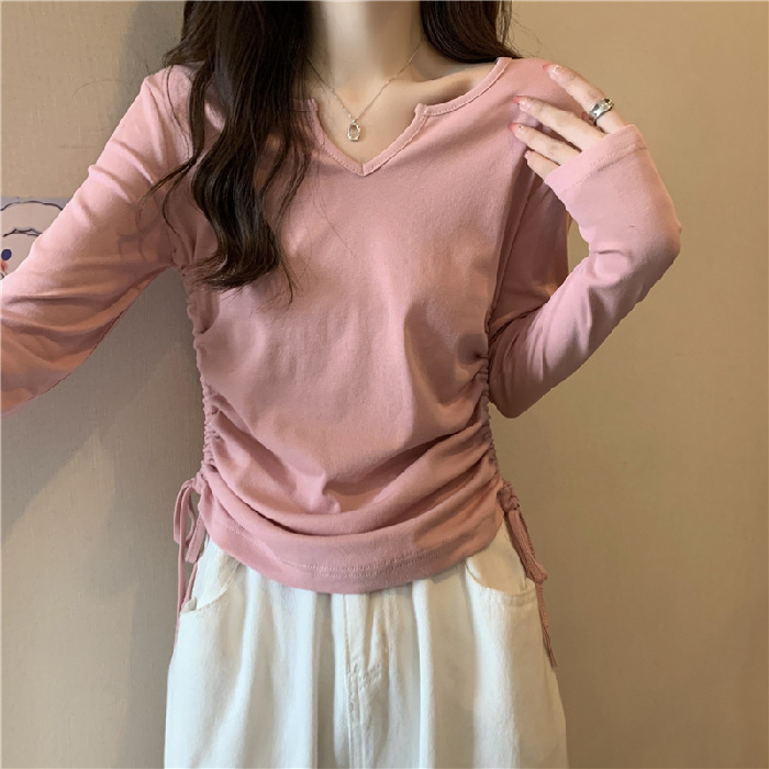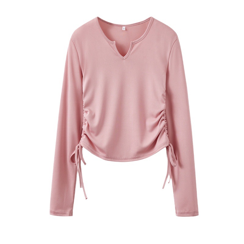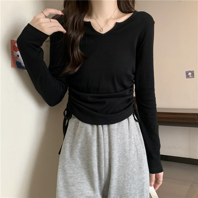 新款设计感侧边抽绳V领修身显瘦百搭短款T恤春秋打底衫上衣女