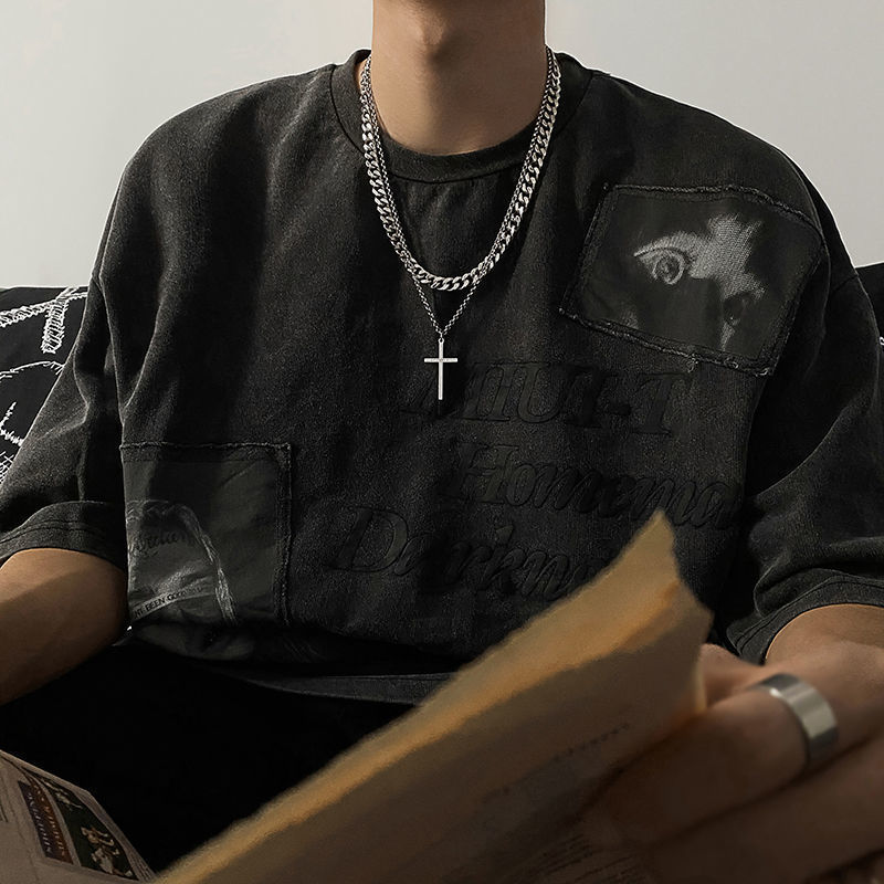 夏季创意时尚棉质短袖T恤男潮牌痞帅半袖体恤新款夏装休闲半截袖