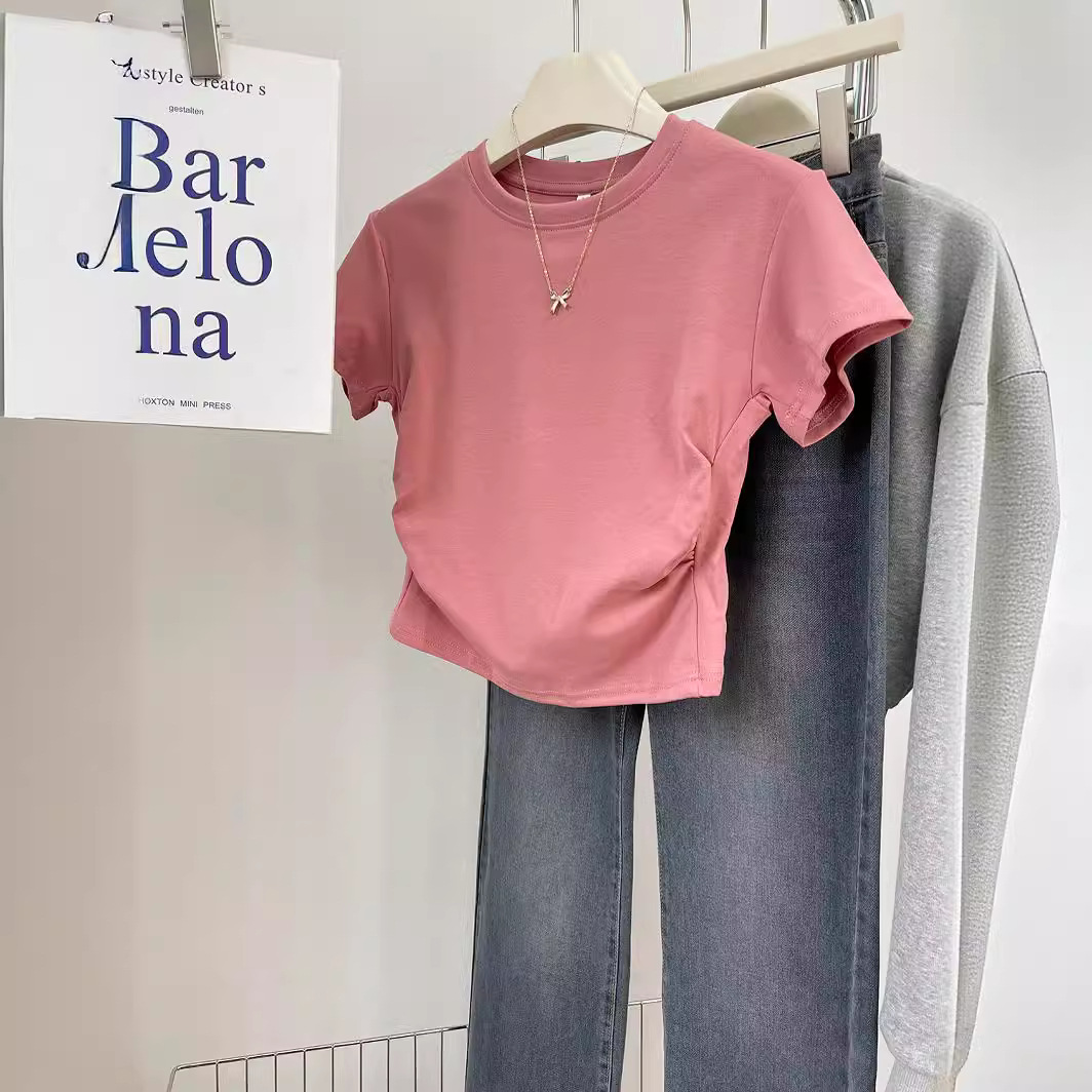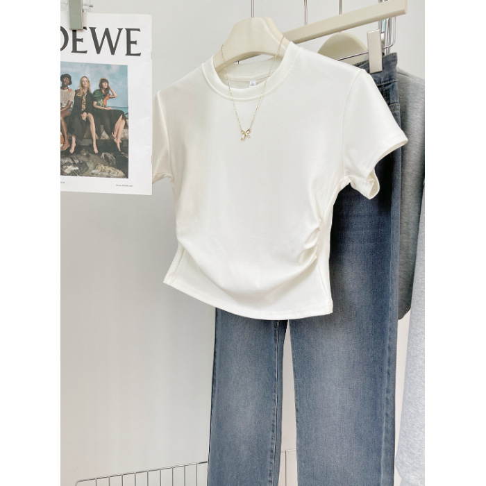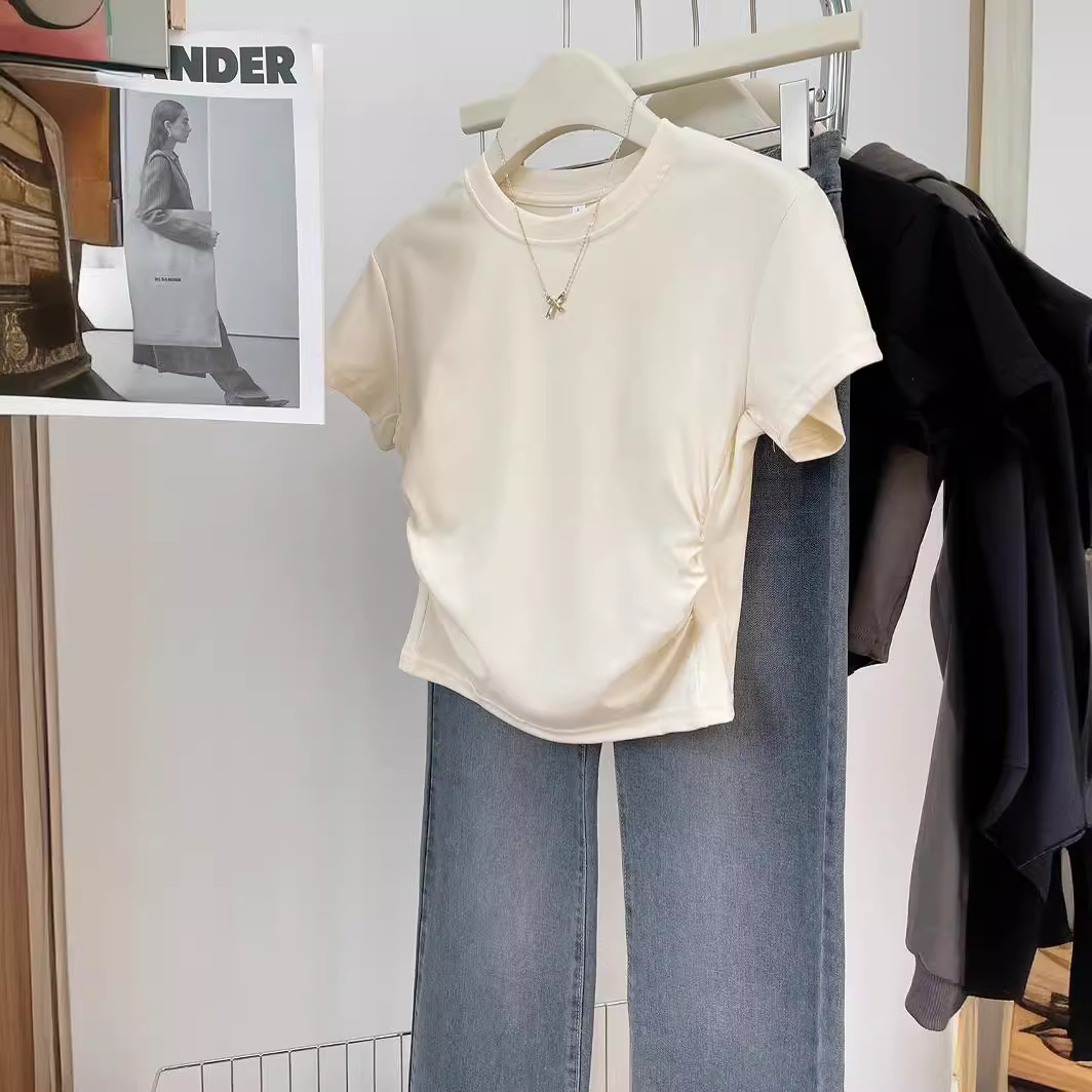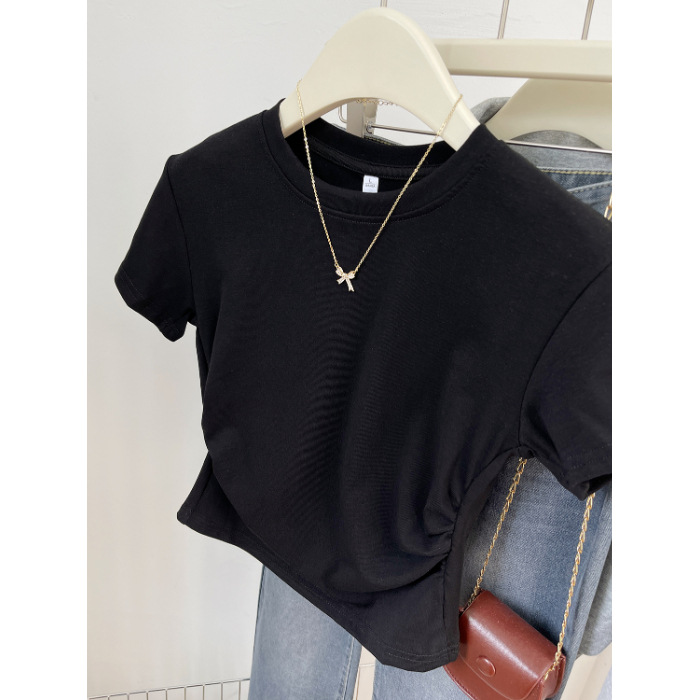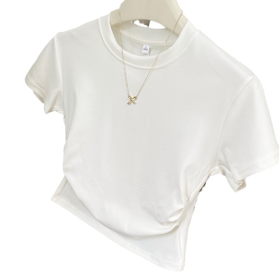 小个子正肩短袖T恤女甜辣妹修身显瘦纯欲风不规则褶皱短款小衫夏