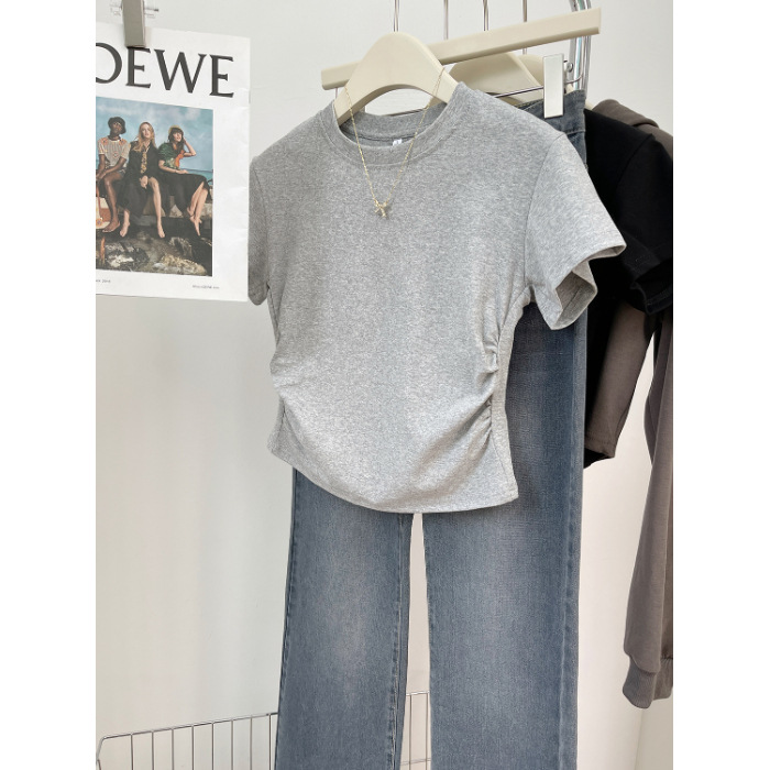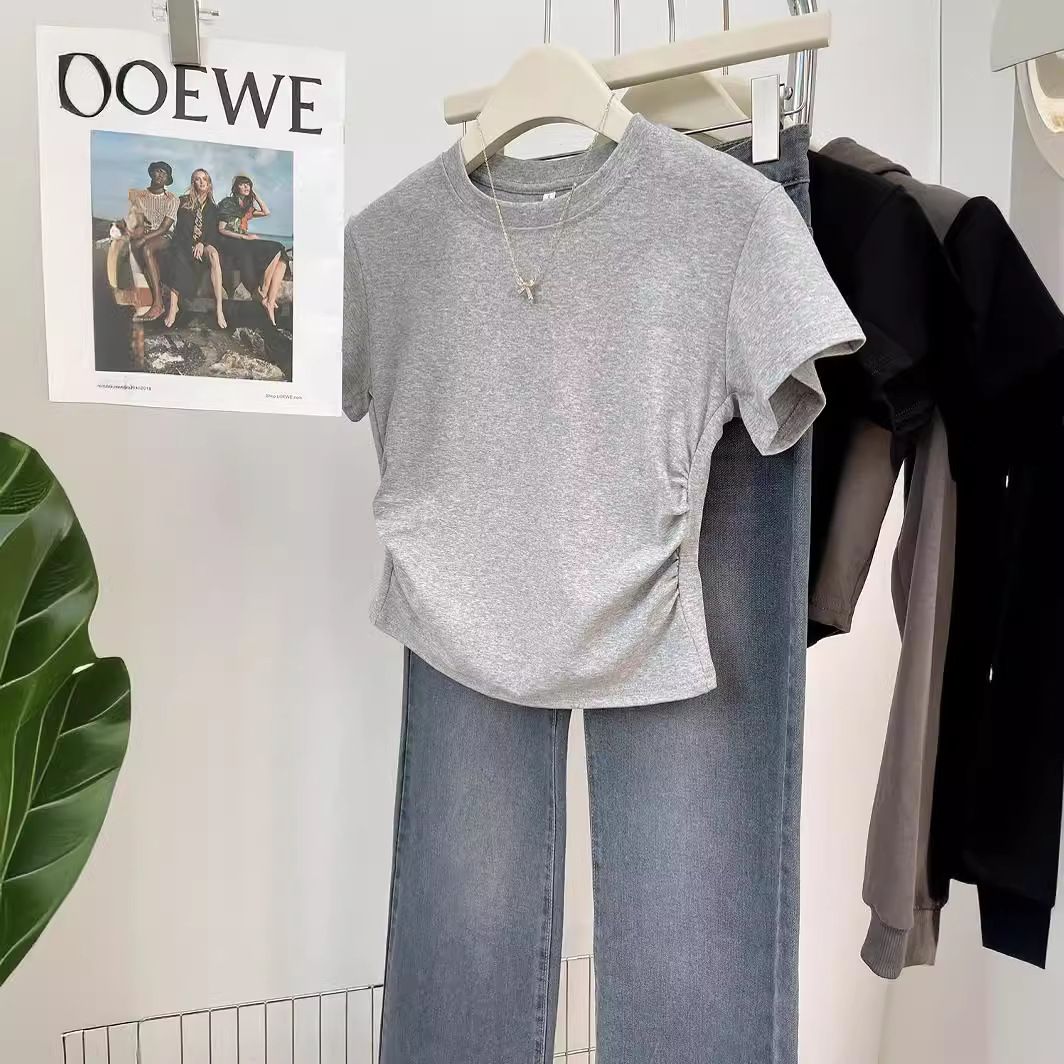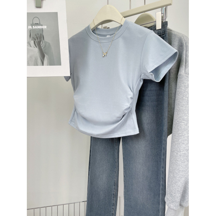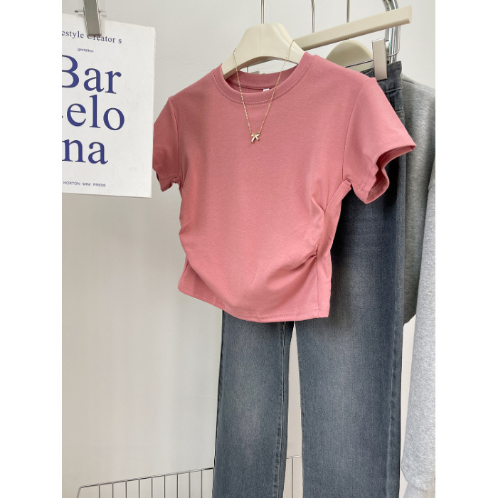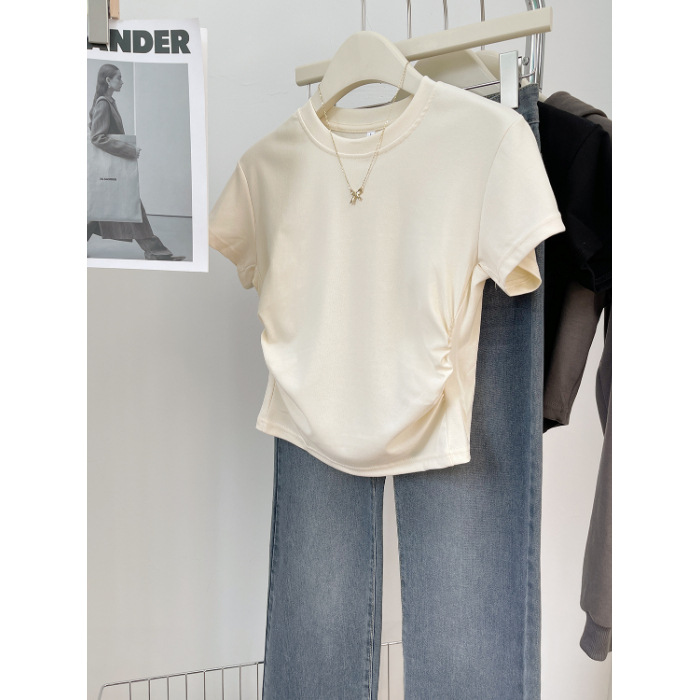 小个子正肩短袖T恤女甜辣妹修身显瘦纯欲风不规则褶皱短款小衫夏