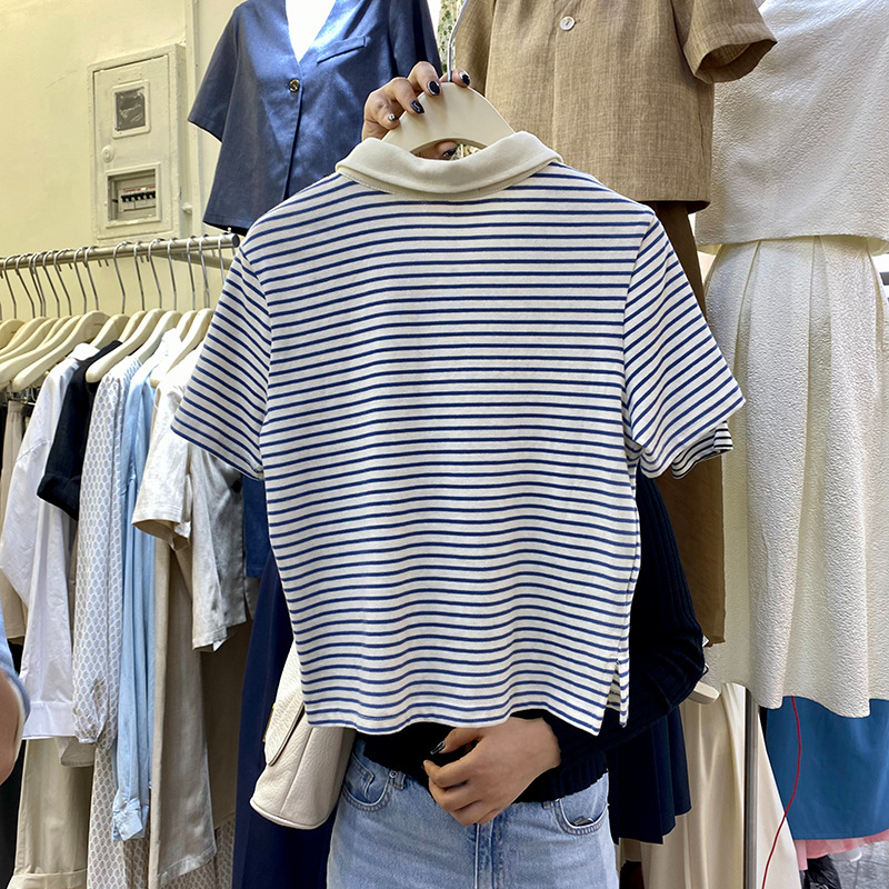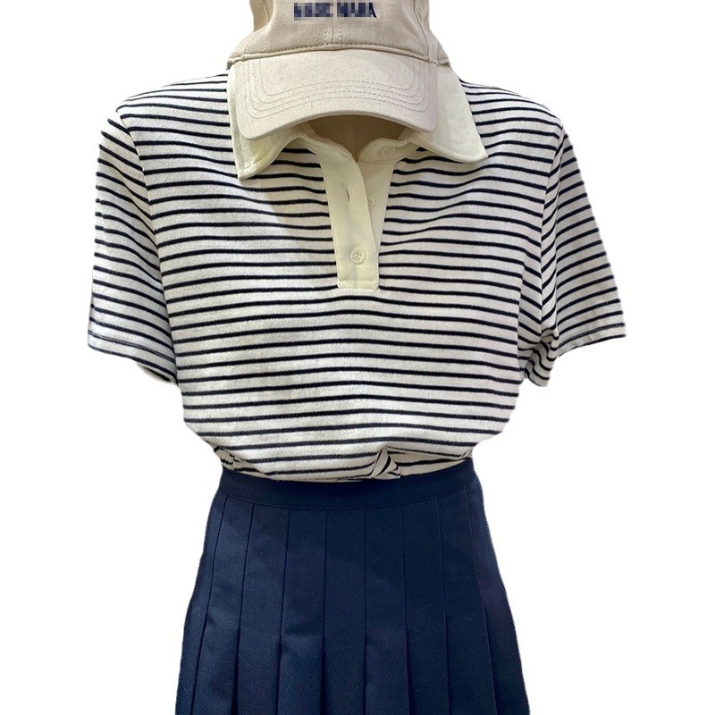 夏新款时尚减龄条纹短袖纯棉T恤女小个子正肩Polo领百搭上衣