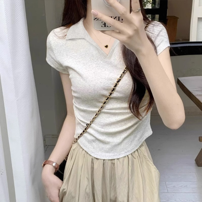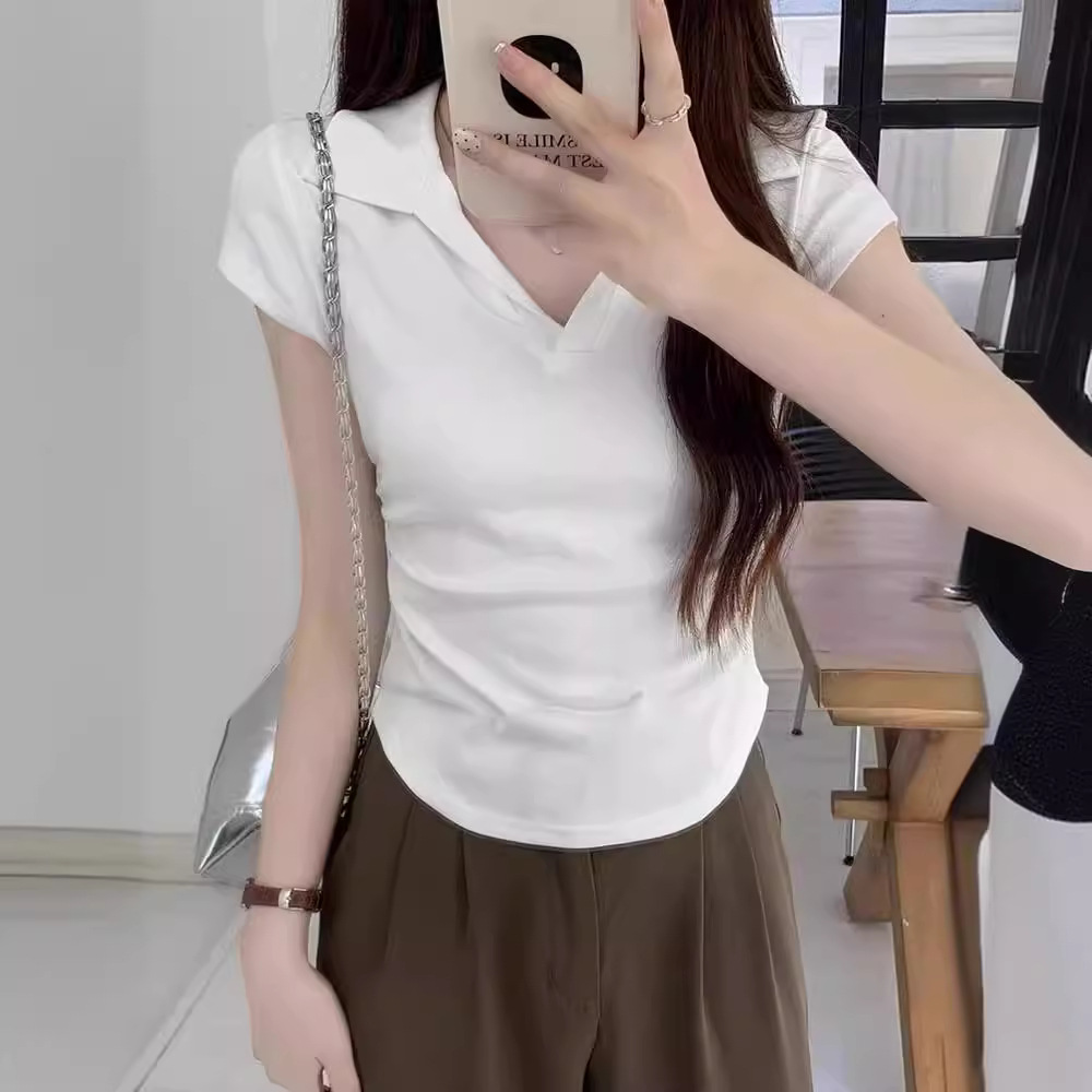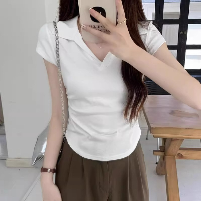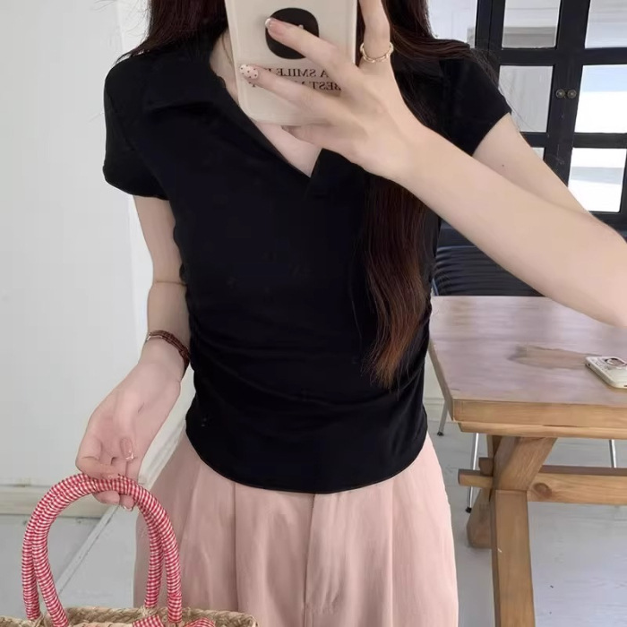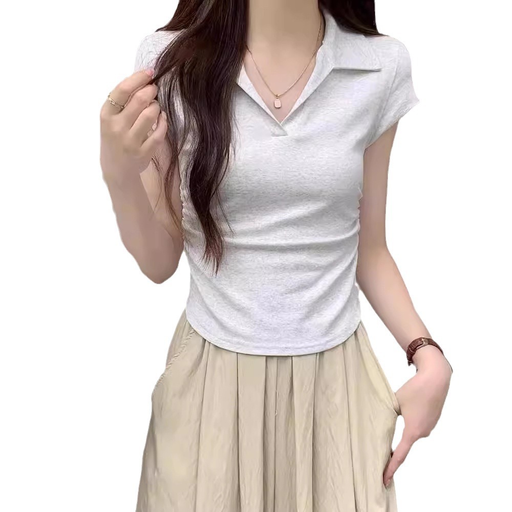 小个子纯棉修身显瘦短袖T恤女侧身弹力收腰设计正肩Polo领上衣夏