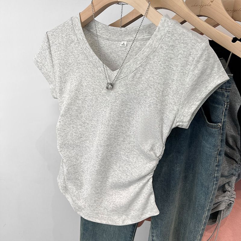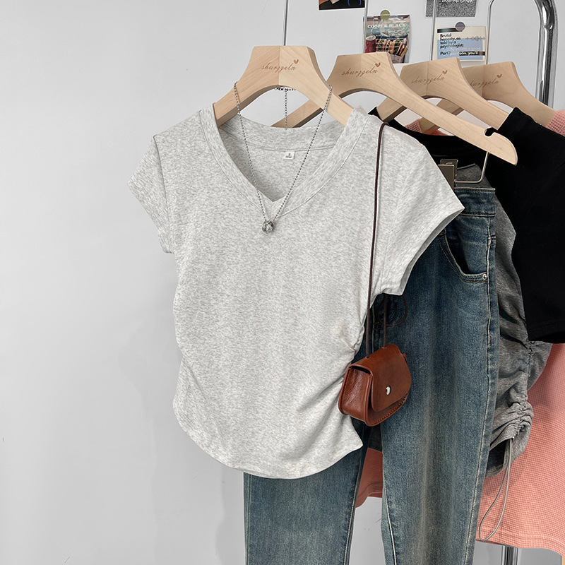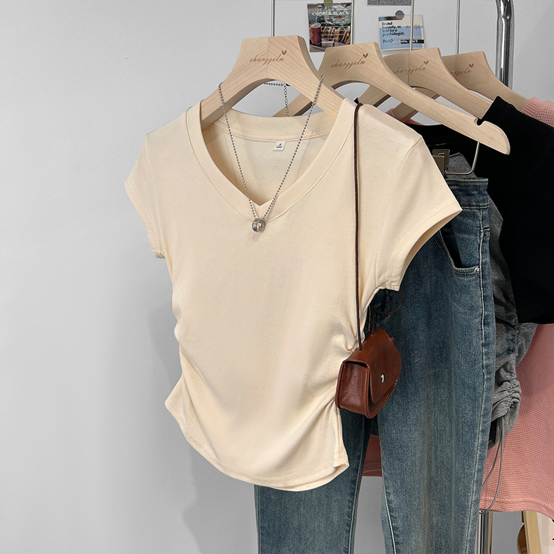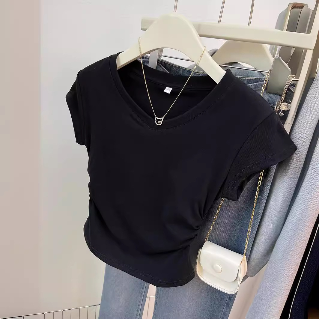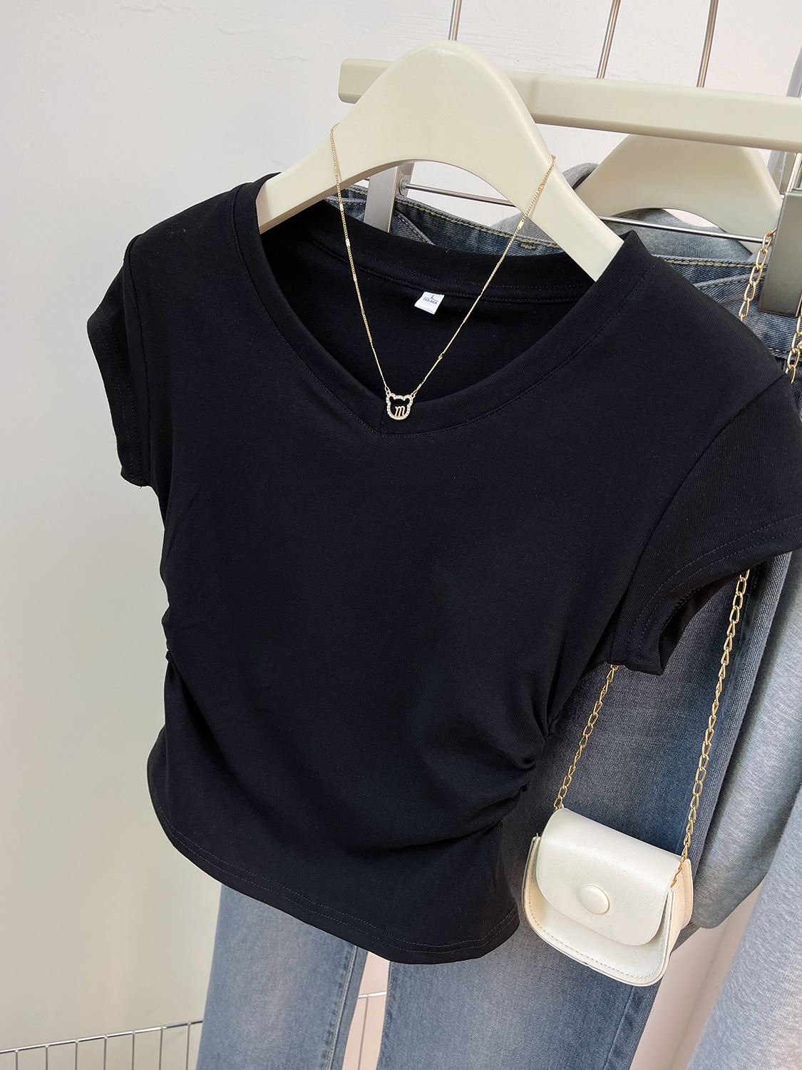 V领正肩短袖T恤女春夏纯棉设计感褶皱修身显瘦不规则短款上衣