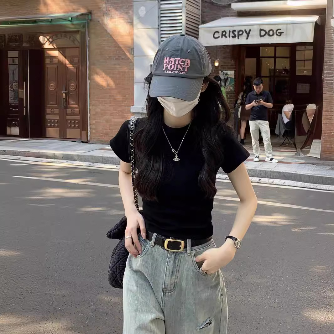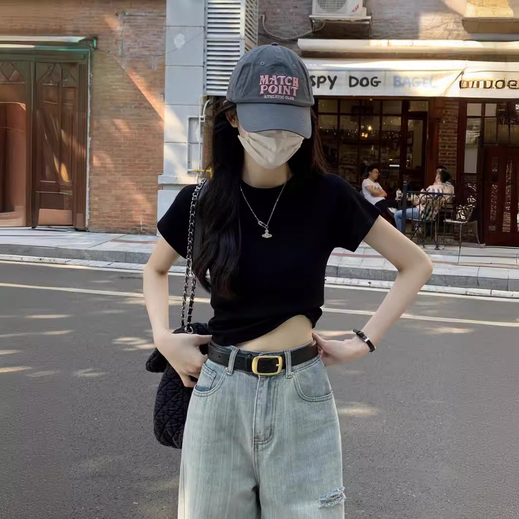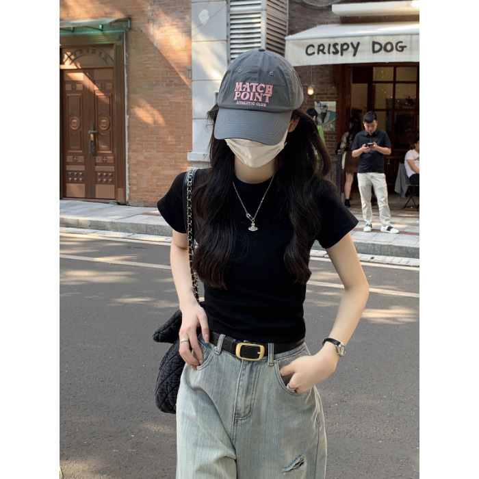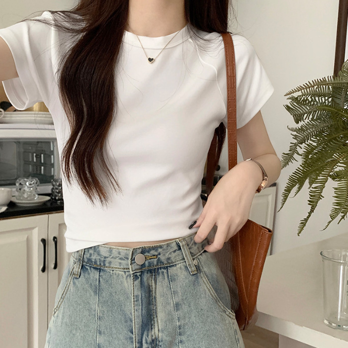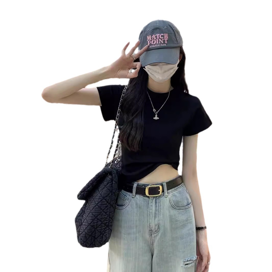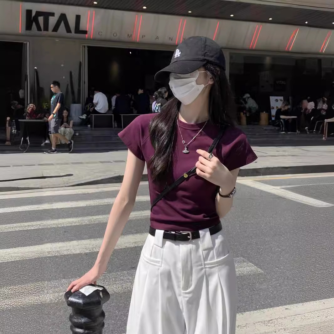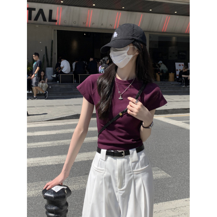 紫色显白圆领正肩修身短袖T恤女高腰显瘦辣妹短上衣春夏百搭打底
