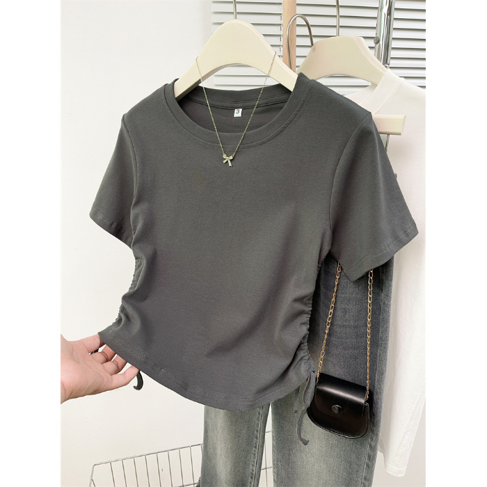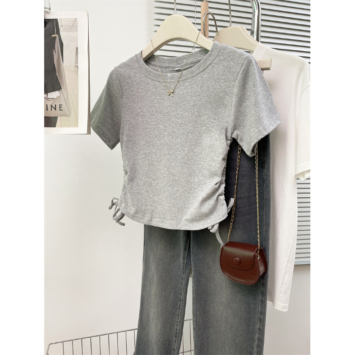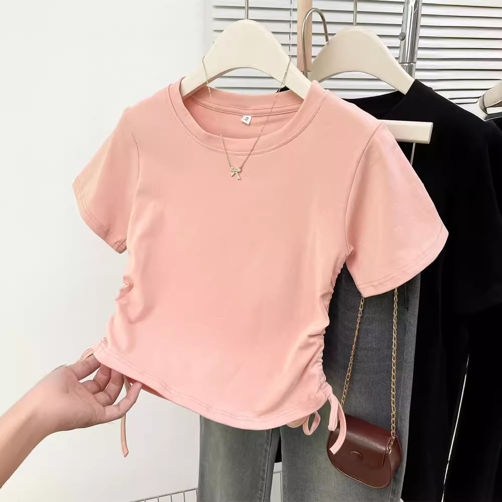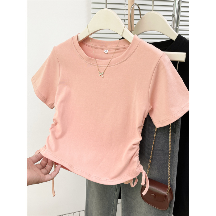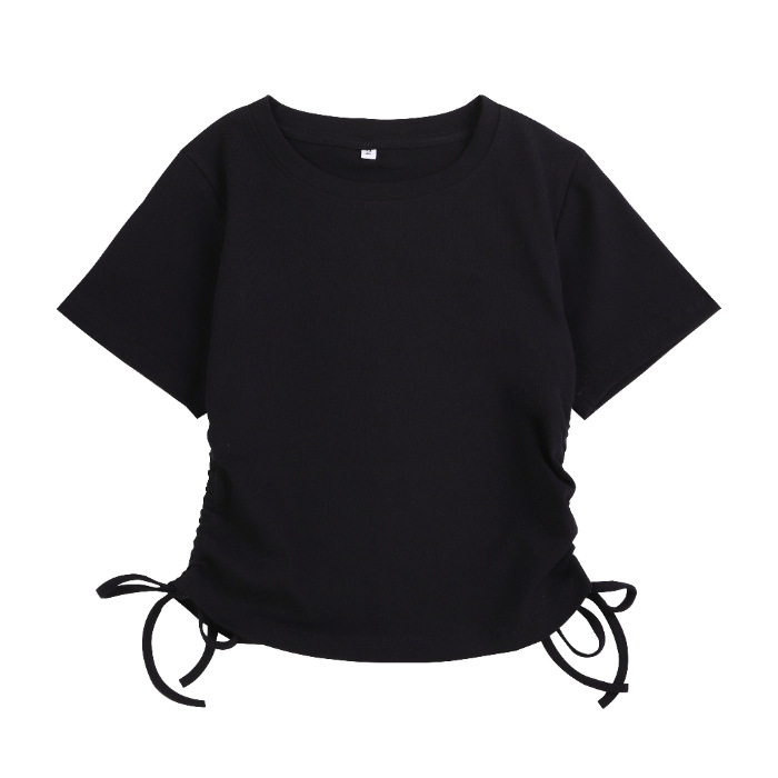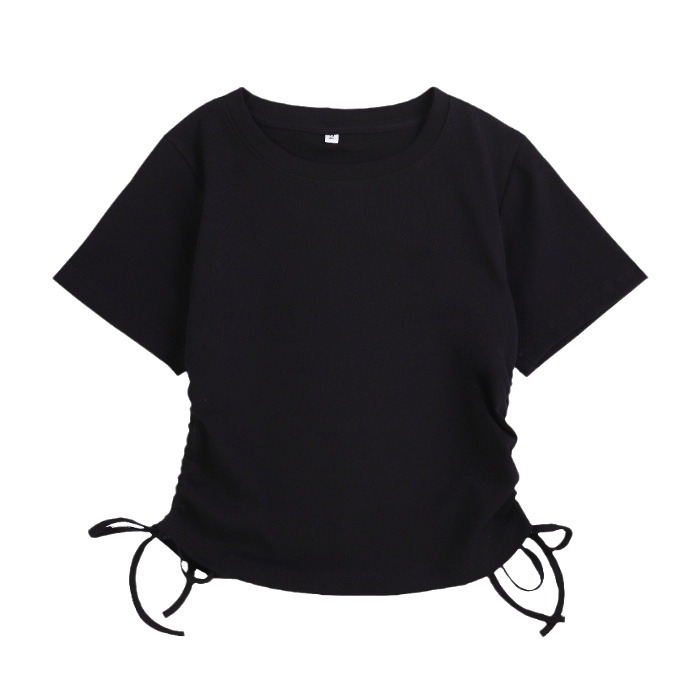小个子夏季修身显瘦短款上衣女韩版双侧边系带褶皱感短袖T恤