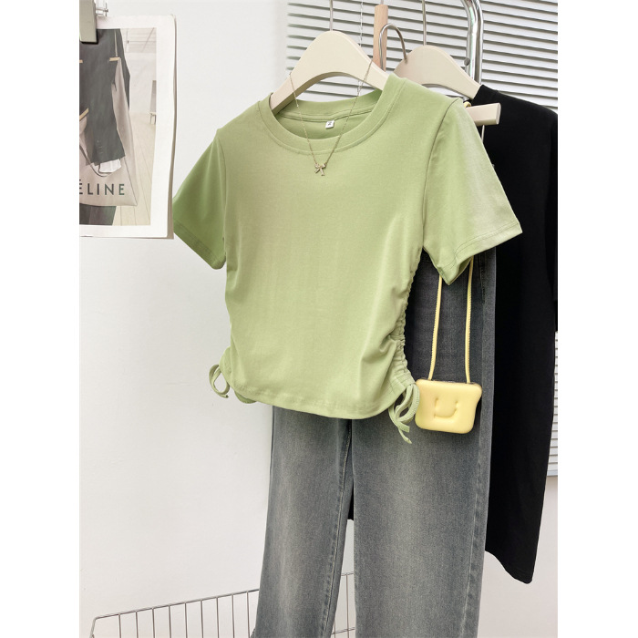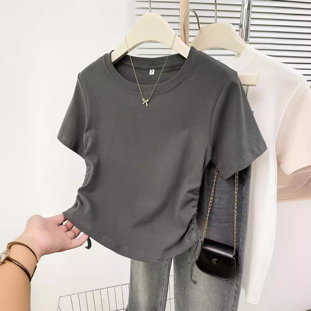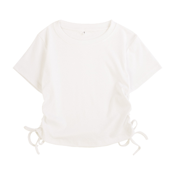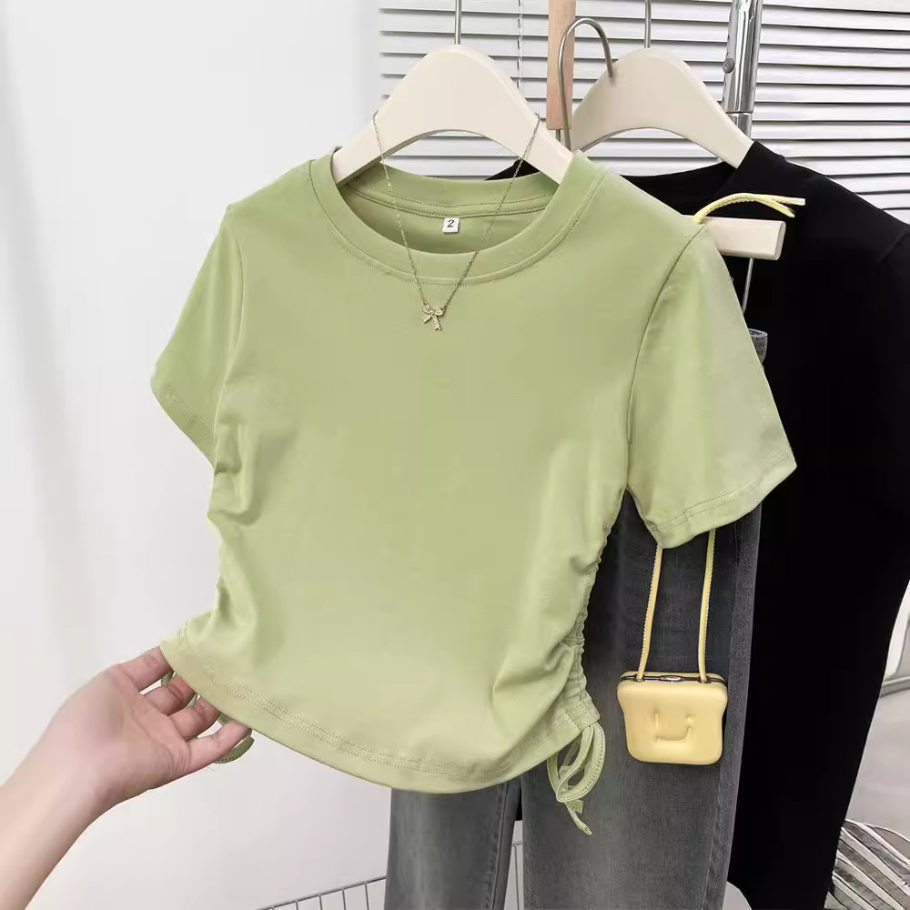 小个子夏季修身显瘦短款上衣女韩版双侧边系带褶皱感短袖T恤