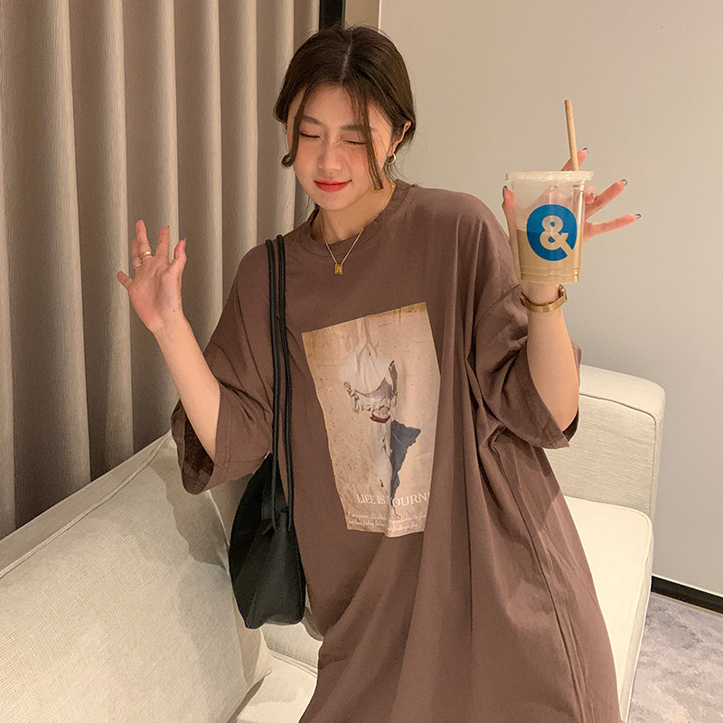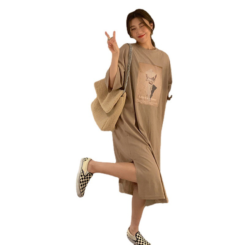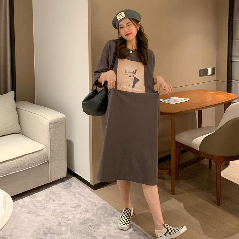 胖MM大码180斤孕妇T恤长裙夏季宽松遮肚子藏肉显瘦过膝开叉连衣裙