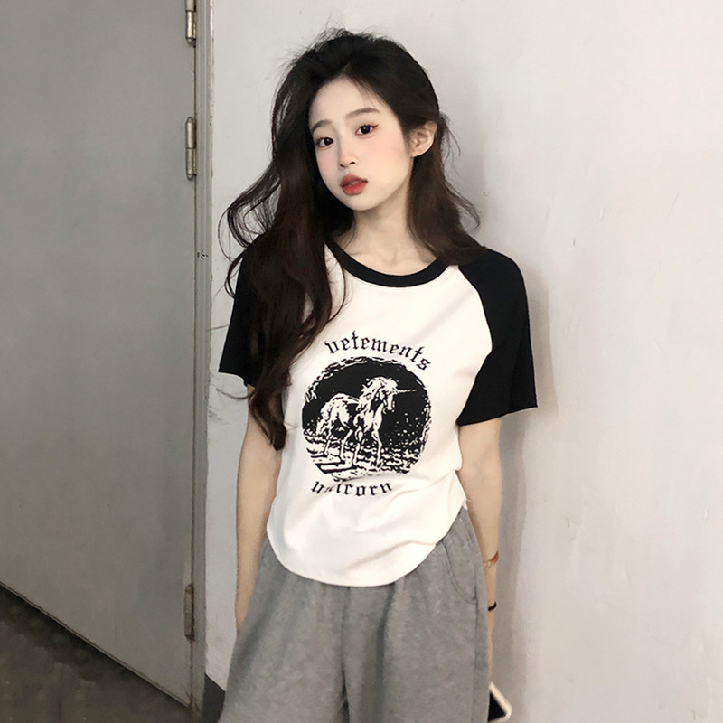2025新款辣妹显瘦学院风初中学生插肩袖拼接显瘦短袖t恤女上衣潮