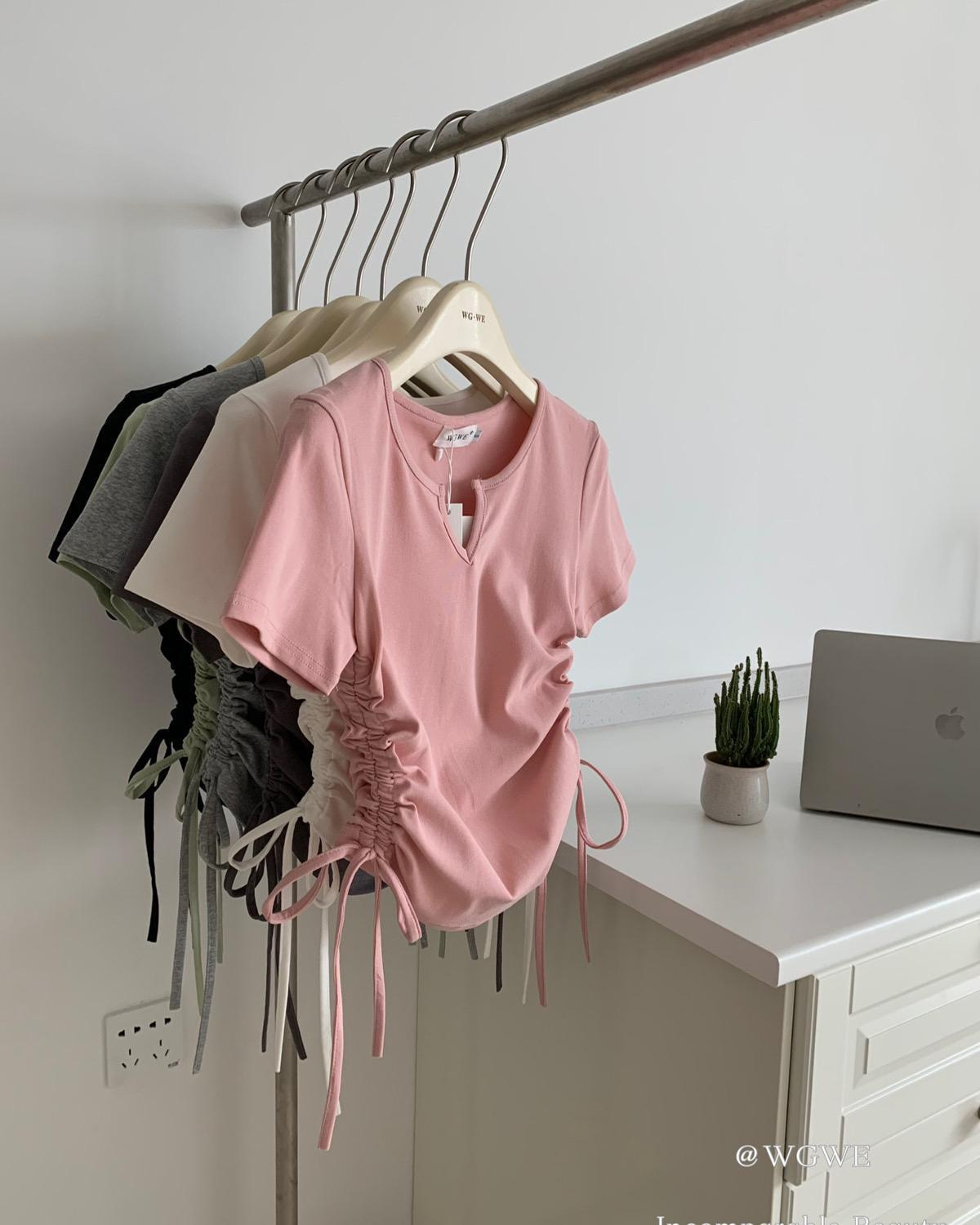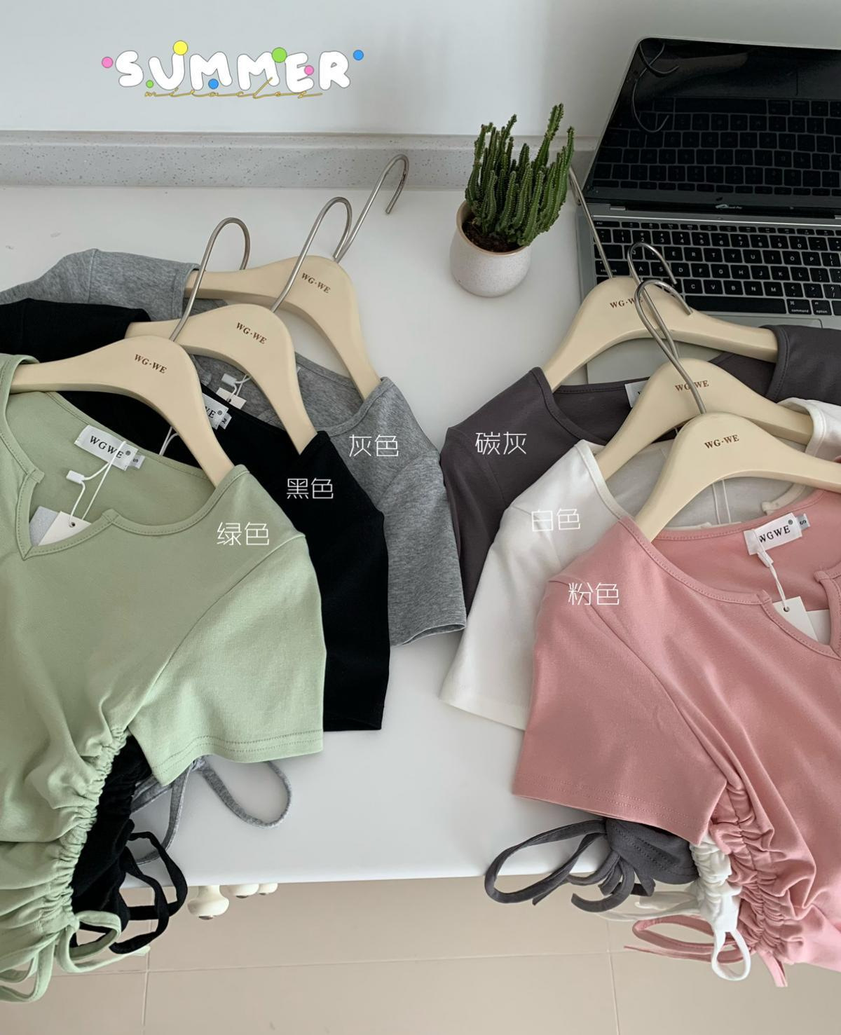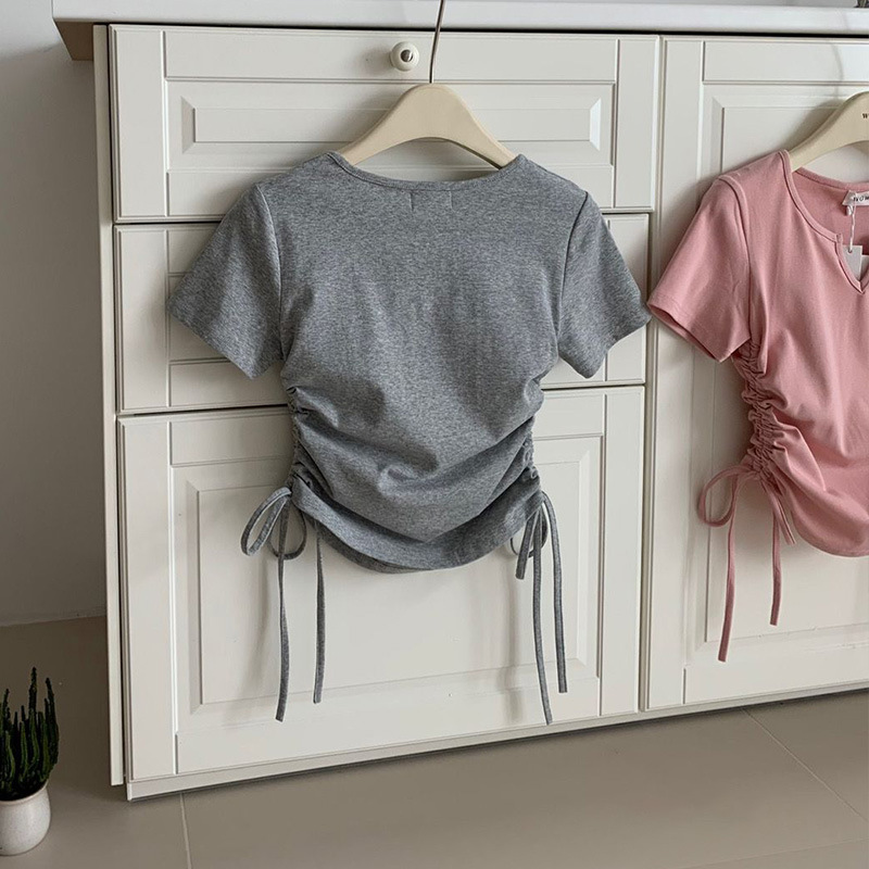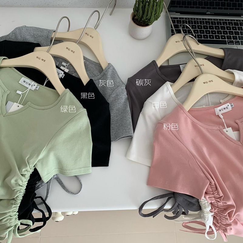夏季新款韩版设计感小众辣妹正肩上衣女短袖t恤显瘦v领瑜伽服