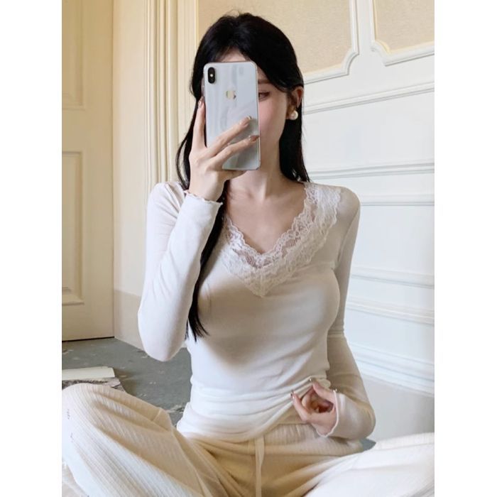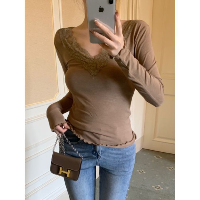 小众设计感蕾丝德绒打底衫女2025年春秋冬纯欲V领大衣内搭小衫潮