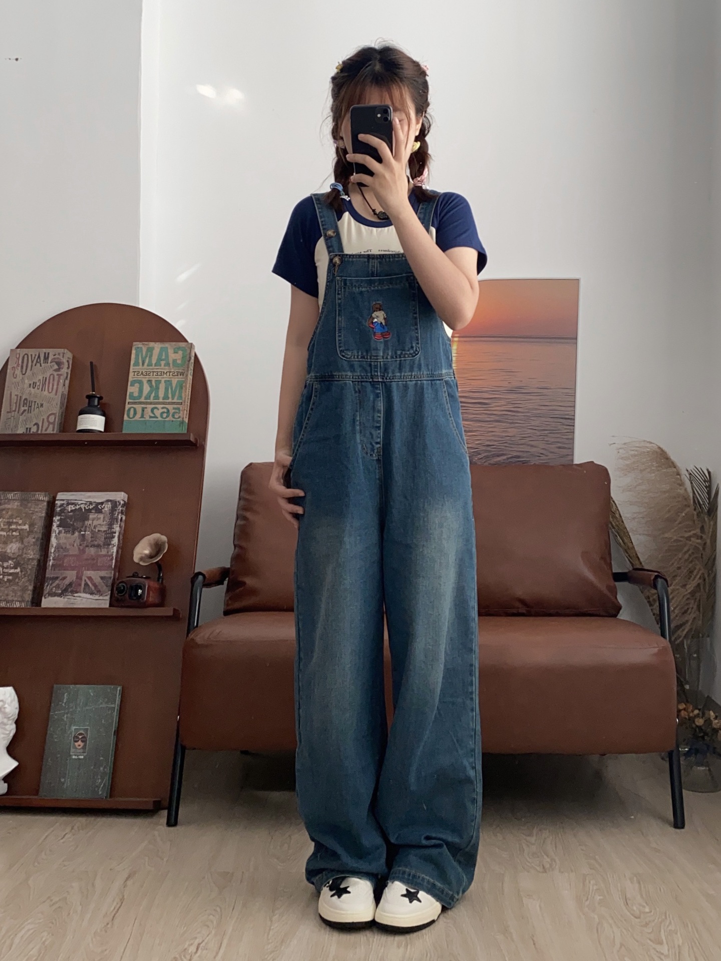 春夏新款牛仔背带裤女宽松遮胯显瘦阔腿裤小个子吊带连体长裤
