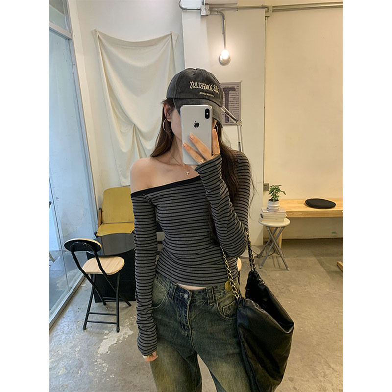 设计感斜肩条纹打底衫长袖露肩T恤女春秋新款时尚百搭上衣潮
