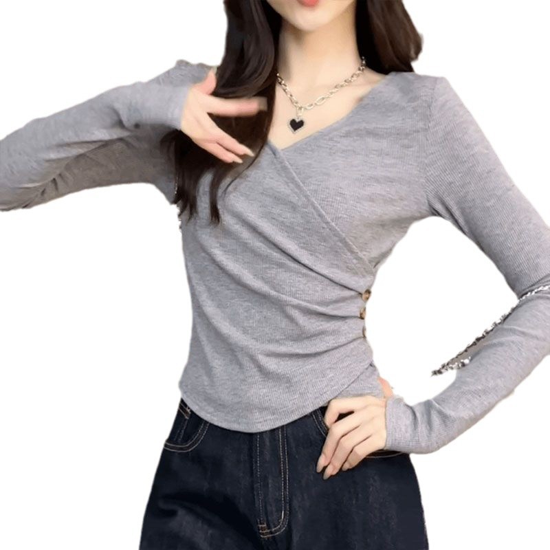 韩系气质不规则V领长袖T恤女设计感交叉上衣百搭显瘦修身打底衫女