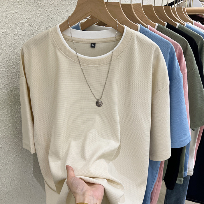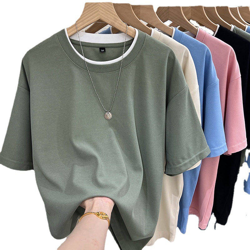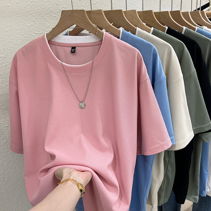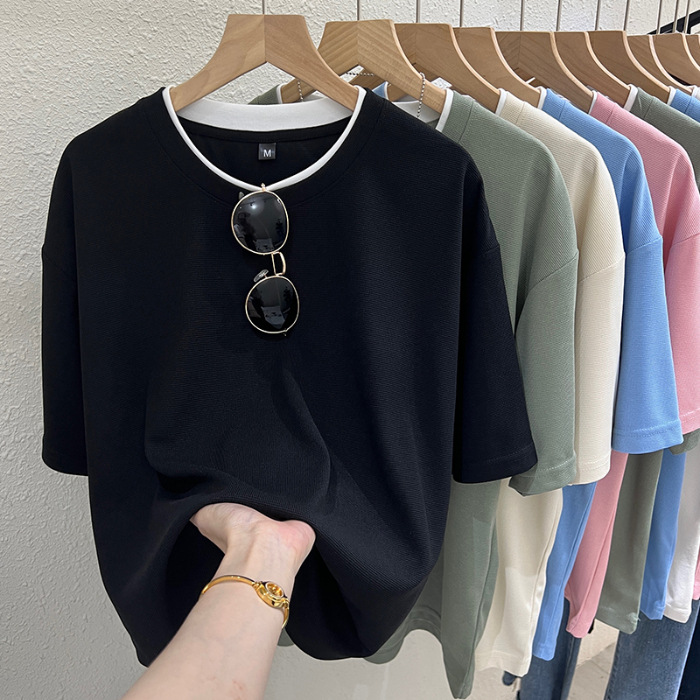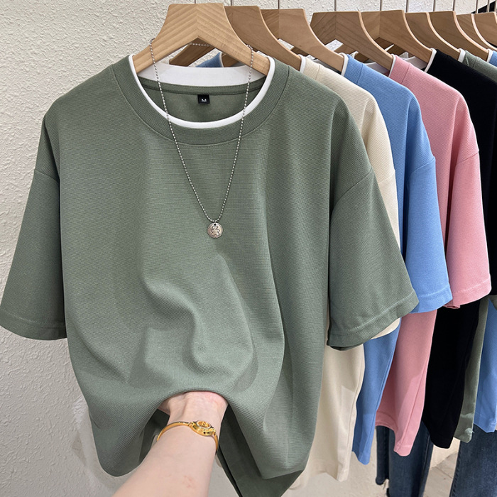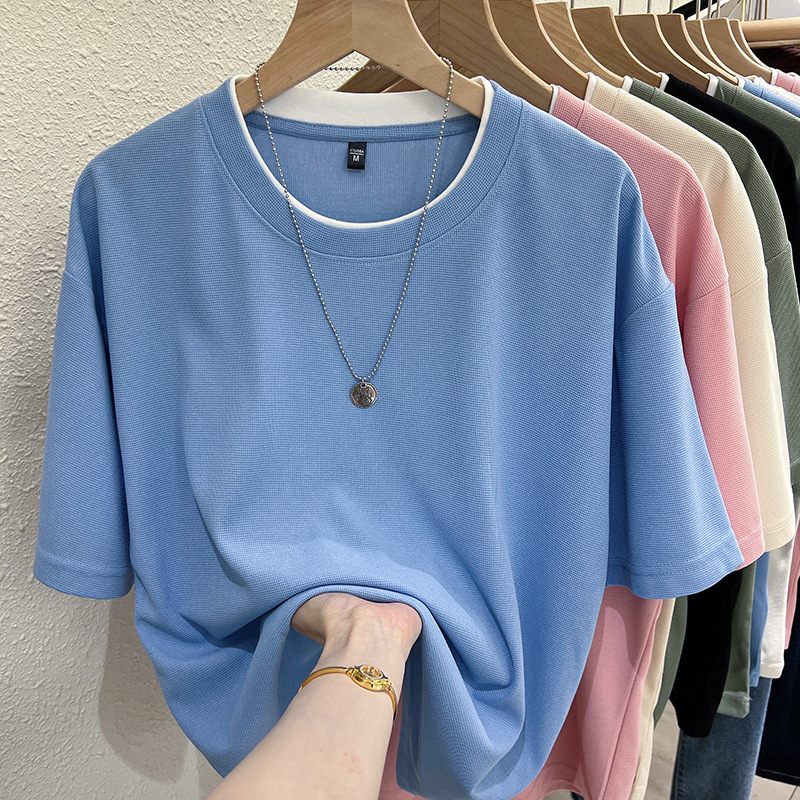 欧美大码女装胖MM200斤夏季短袖T恤宽松休闲小众假两件华夫格上衣