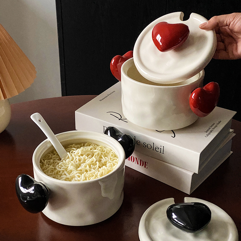 陶瓷猪油罐厨房家用带盖汤碗爱心可爱学生宿舍拉面双耳泡面碗