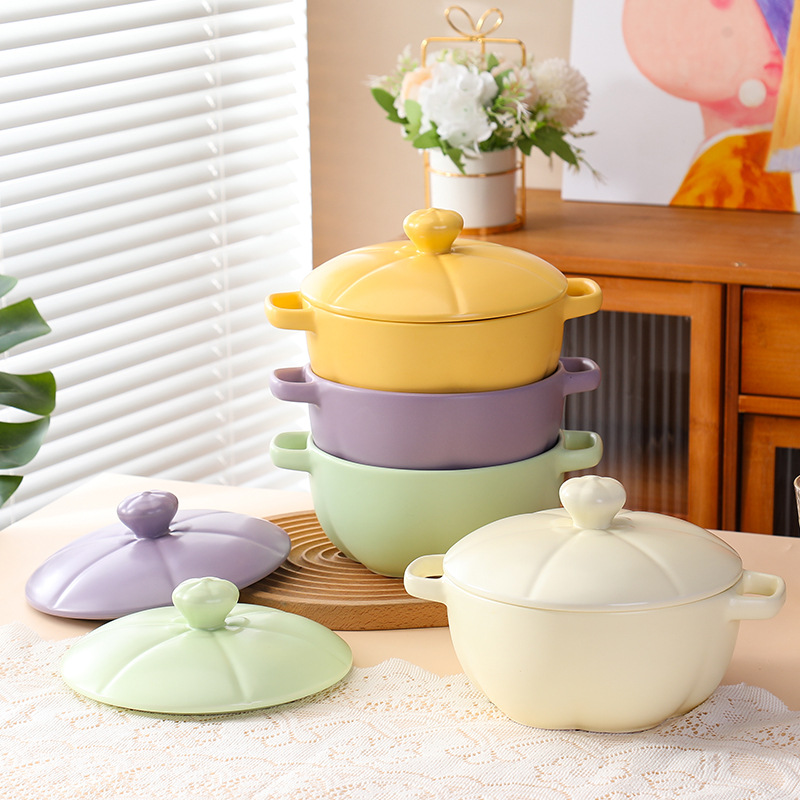奶油风陶瓷猪油罐双耳汤锅家用水果沙拉碗带盖泡面碗大汤碗