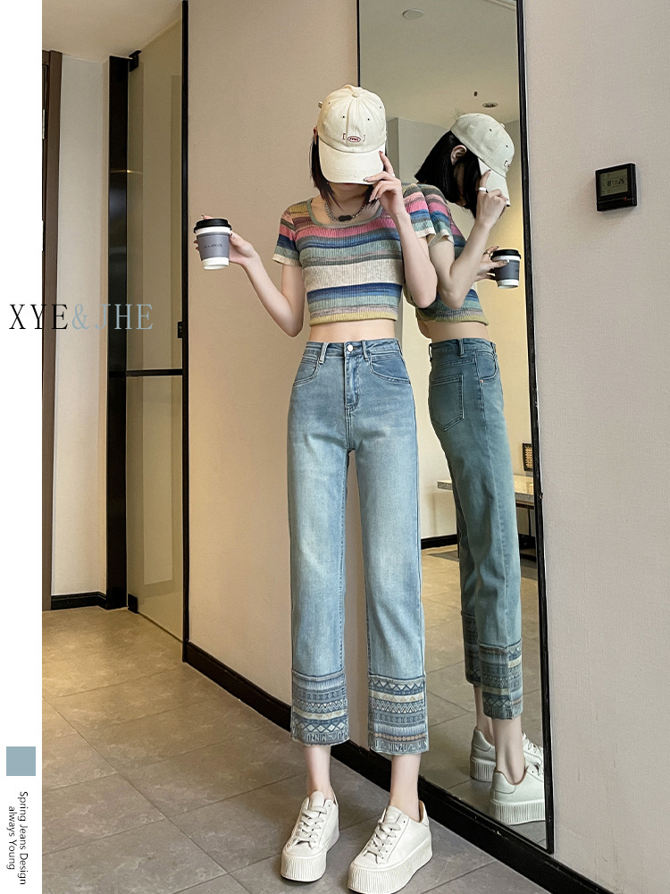 国风烟管牛仔裤女夏天薄款新爆款高腰小个子直筒刺绣八九分