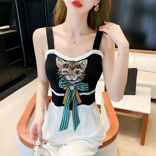 法式针织吊带背心女早秋外穿重工猫咪短款打底黑色抹胸性感吊带
