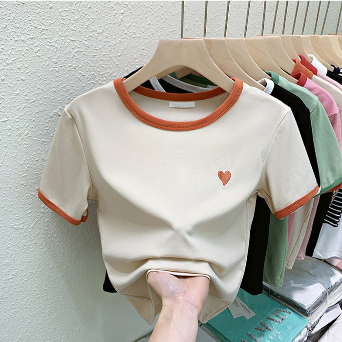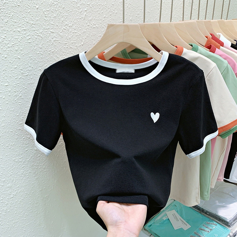 夏装韩版撞色修身显瘦刺绣正肩简约学生棉质学生上衣短袖t恤