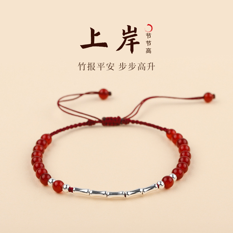 红绳上岸竹节S925银手链女纯手工编织天然红玛瑙本命年编织手绳
