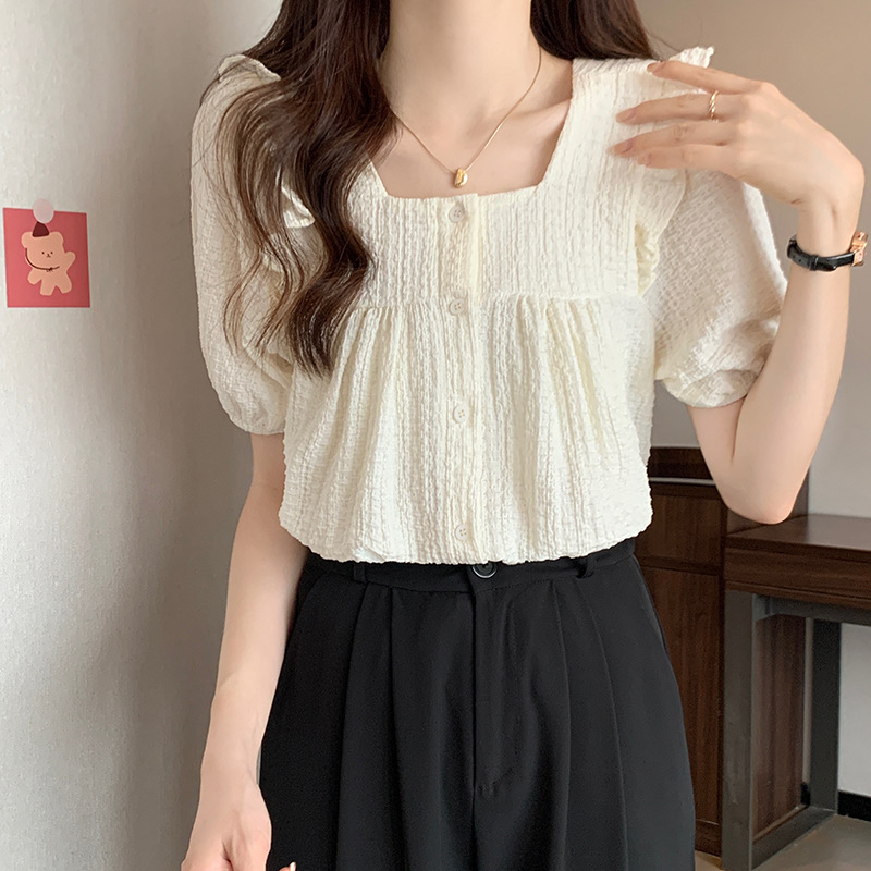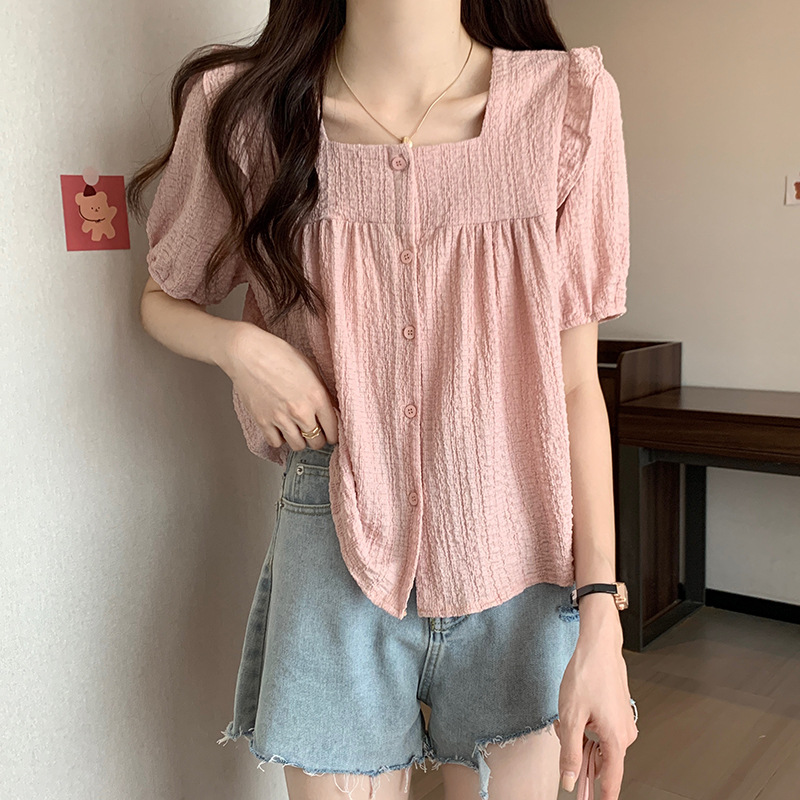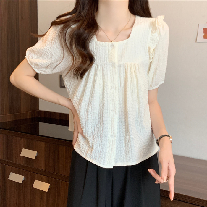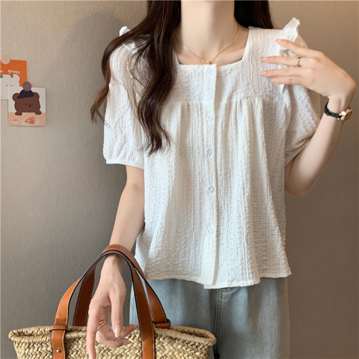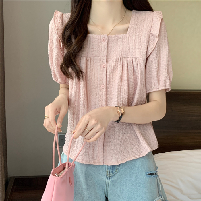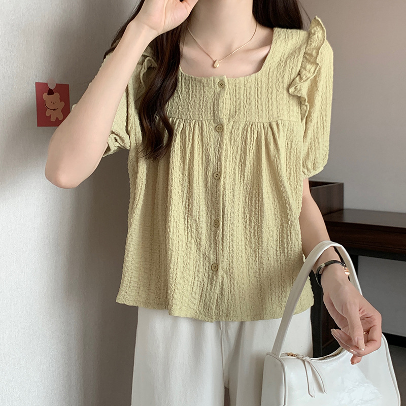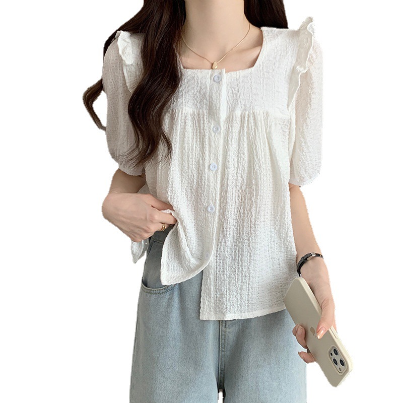 棉质短袖纯色衬衫女森系甜美宽松上衣清新方领衬衣木耳边外穿T恤