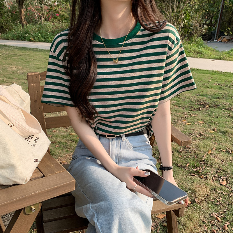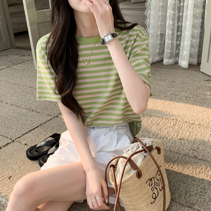 棉质条纹t恤女上衣夏季新款宽松显瘦简约圆领基础款减龄韩版短袖