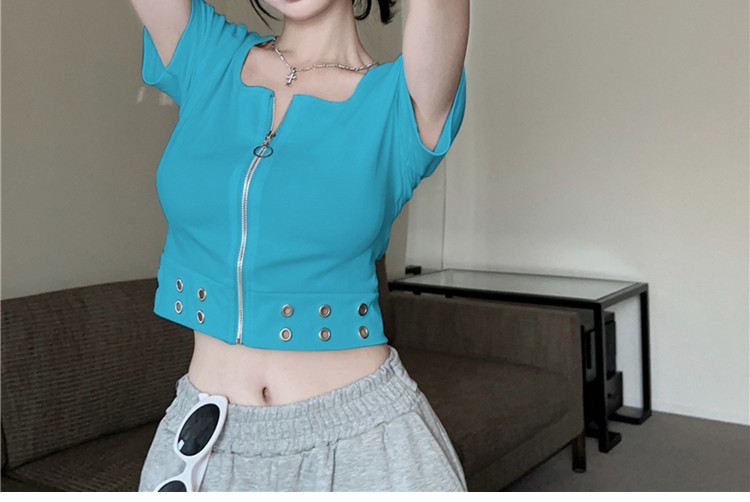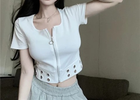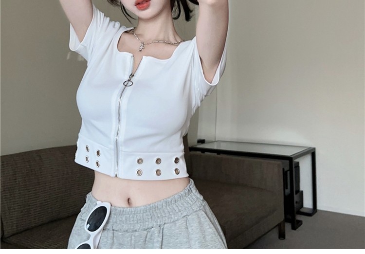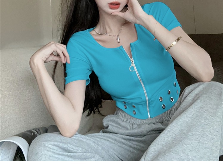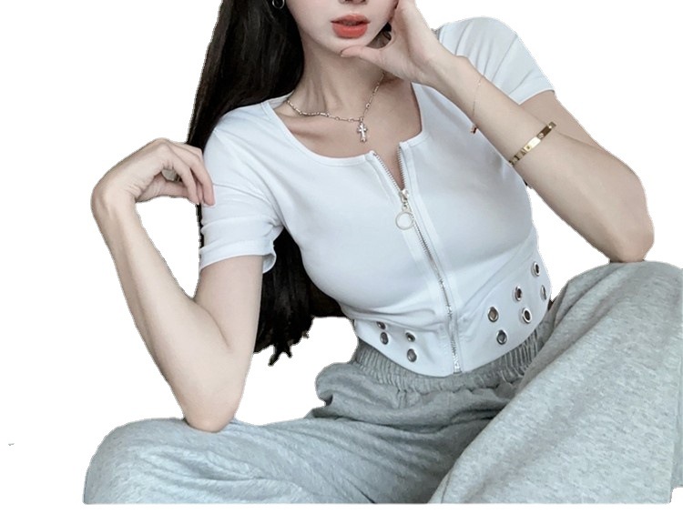棉质短袖t恤女夏季新款拉链设计感小众心机修身显瘦洋气上衣ins潮