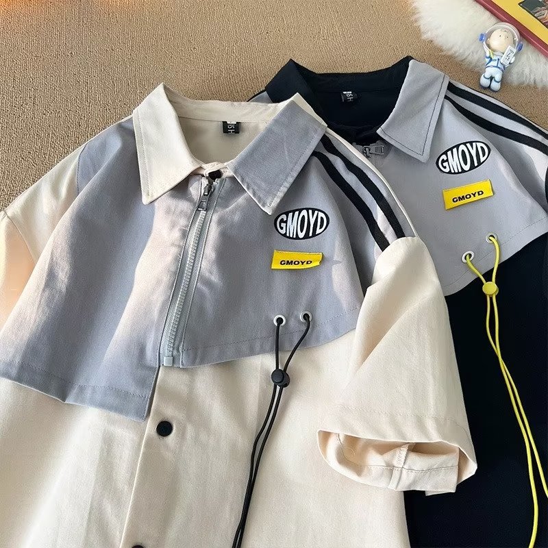 假两件短袖衬衫男生潮牌潮流夏季设计感衬衣休闲宽松美式复古外套