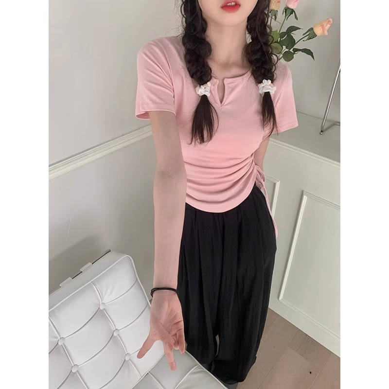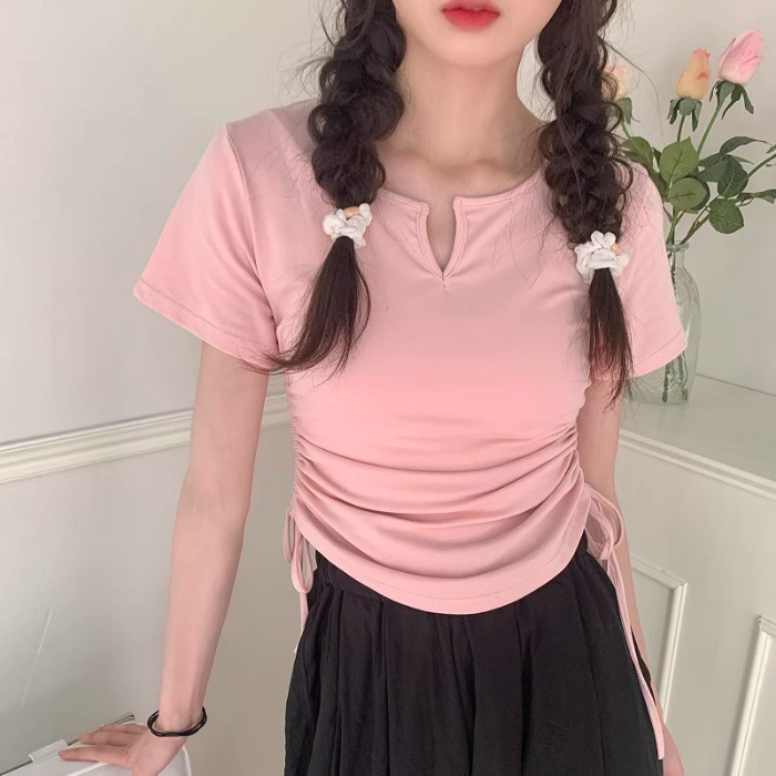 粉色绑带短袖t恤女设计感小众夏季纯欲辣妹性感短款别致独特上衣