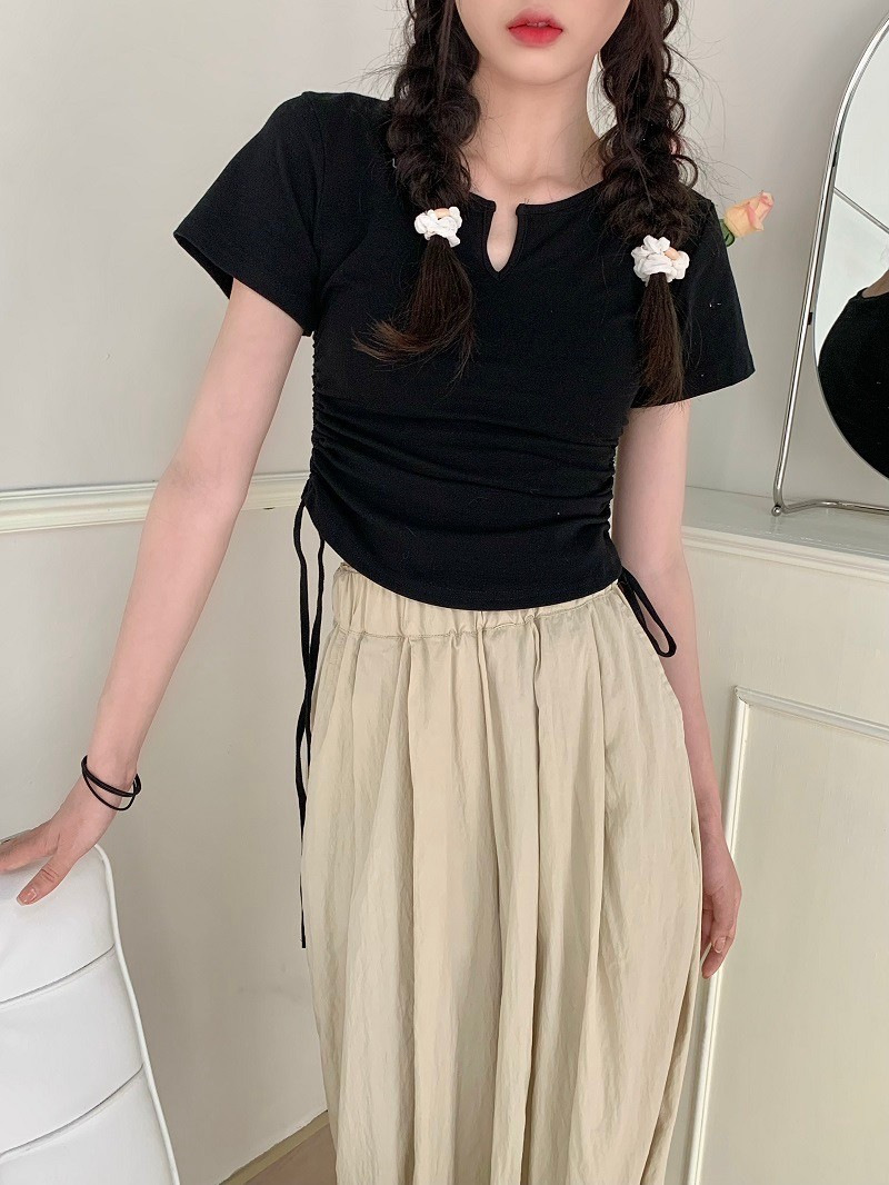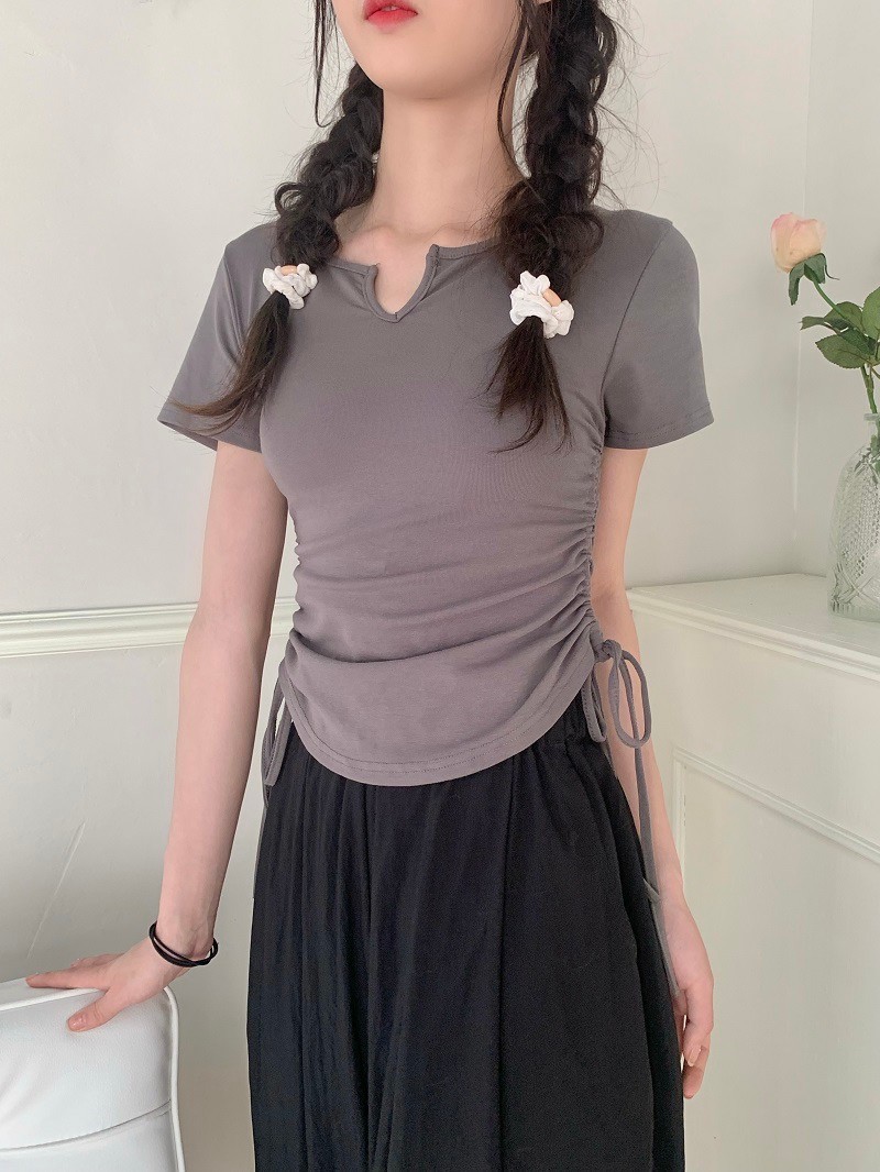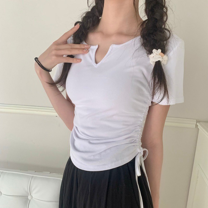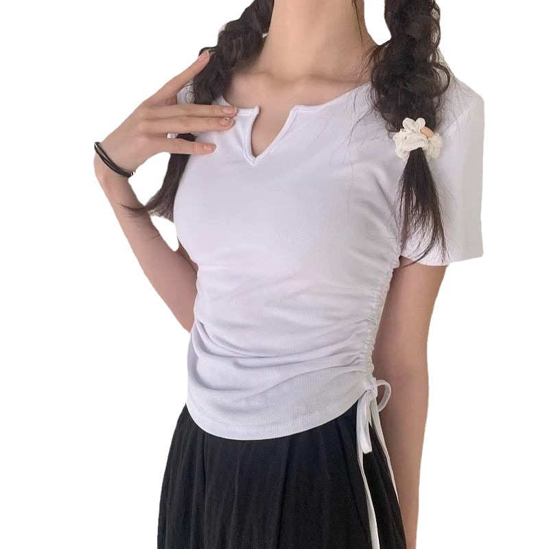 大码女装夏新款v领短袖正肩T恤女胖mm设计感抽绳显瘦辣妹上衣
