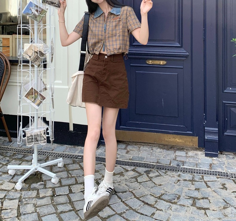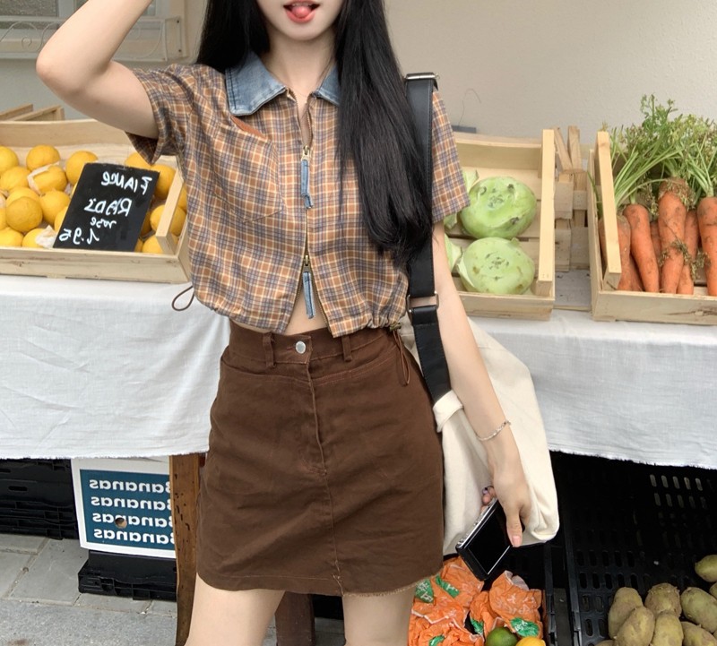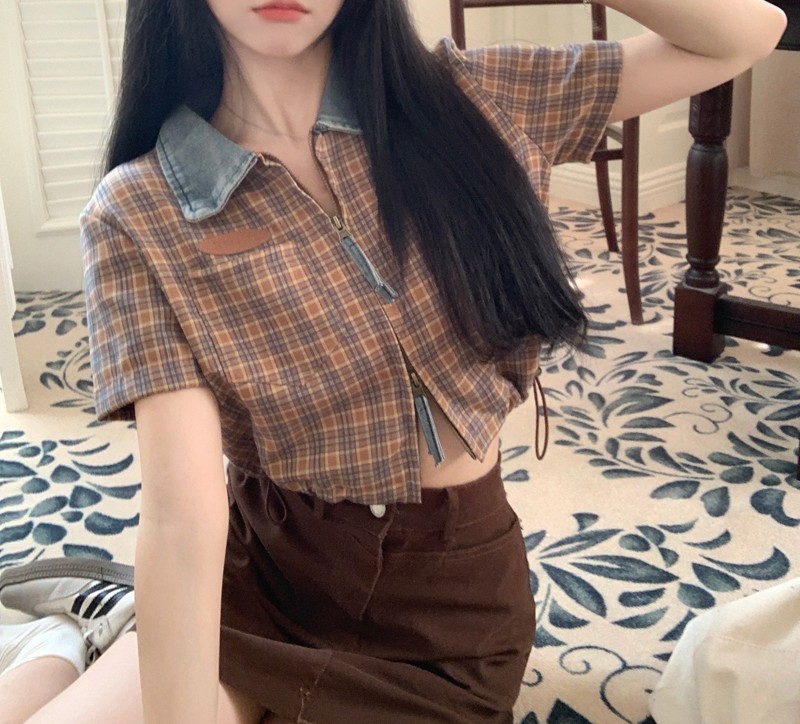 复古辣妹格子短袖衬衫女夏新款设计感T恤收腰显瘦双拉链短款上衣