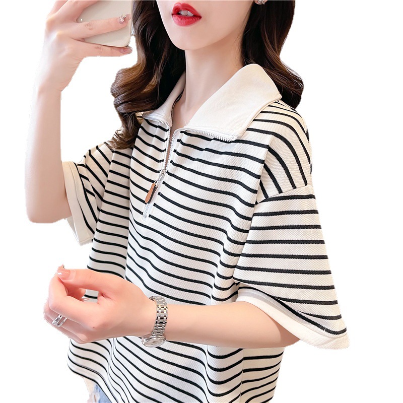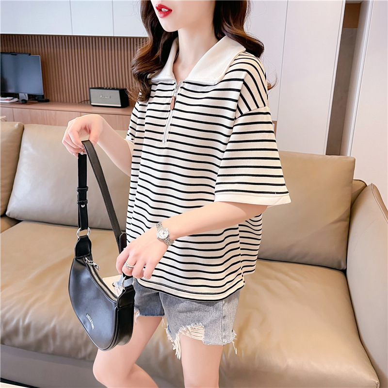 新款复古撞色条纹t恤减龄韩版Polo领短款女装时尚气质棉质上衣服