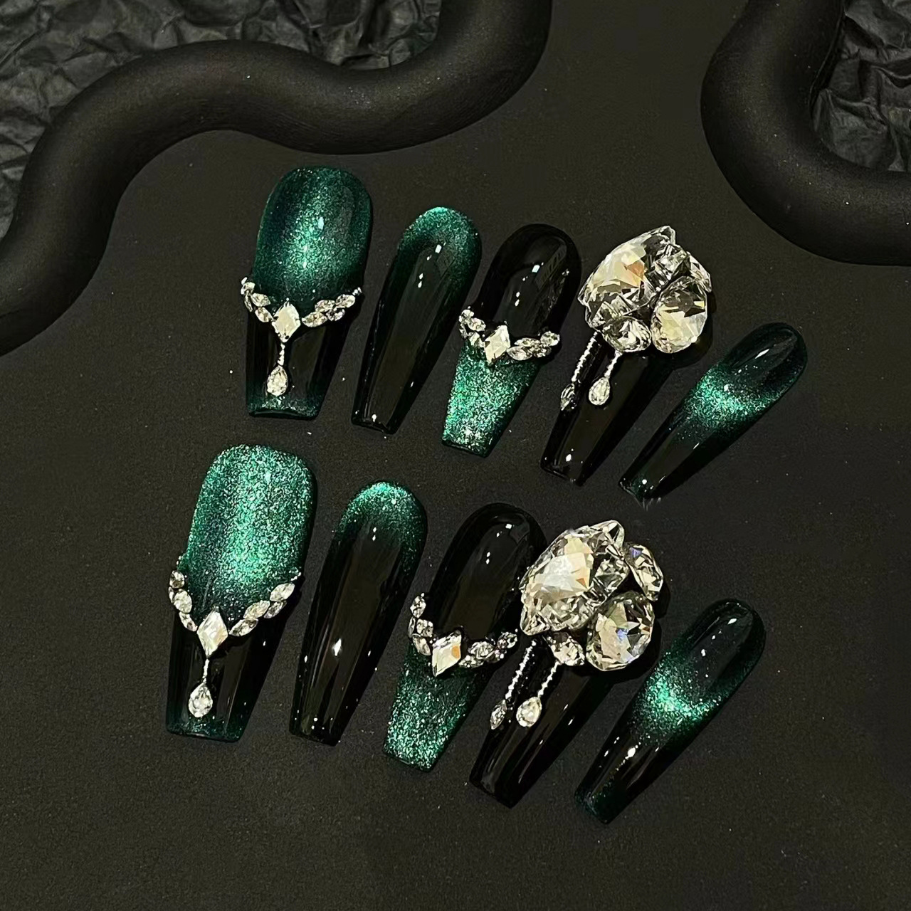 穿戴甲纯手工美甲成品假指甲贴片高级轻奢蓝色猫眼渐变爆闪K9钻