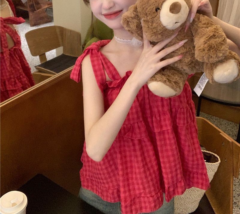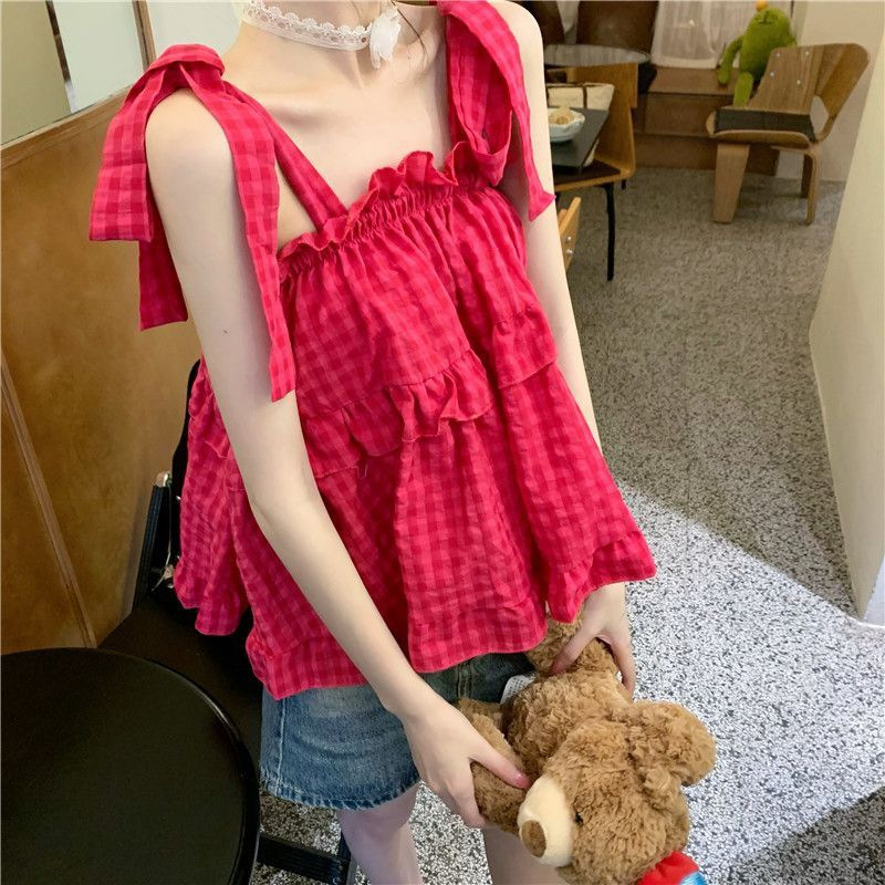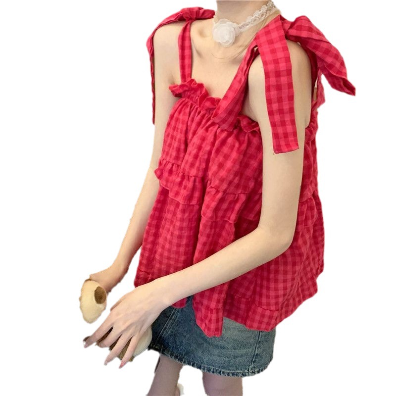 玫红色格子蝴蝶结绑带吊带背心女夏季新款甜美木耳边短款上衣