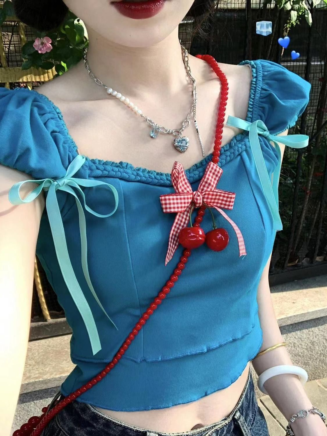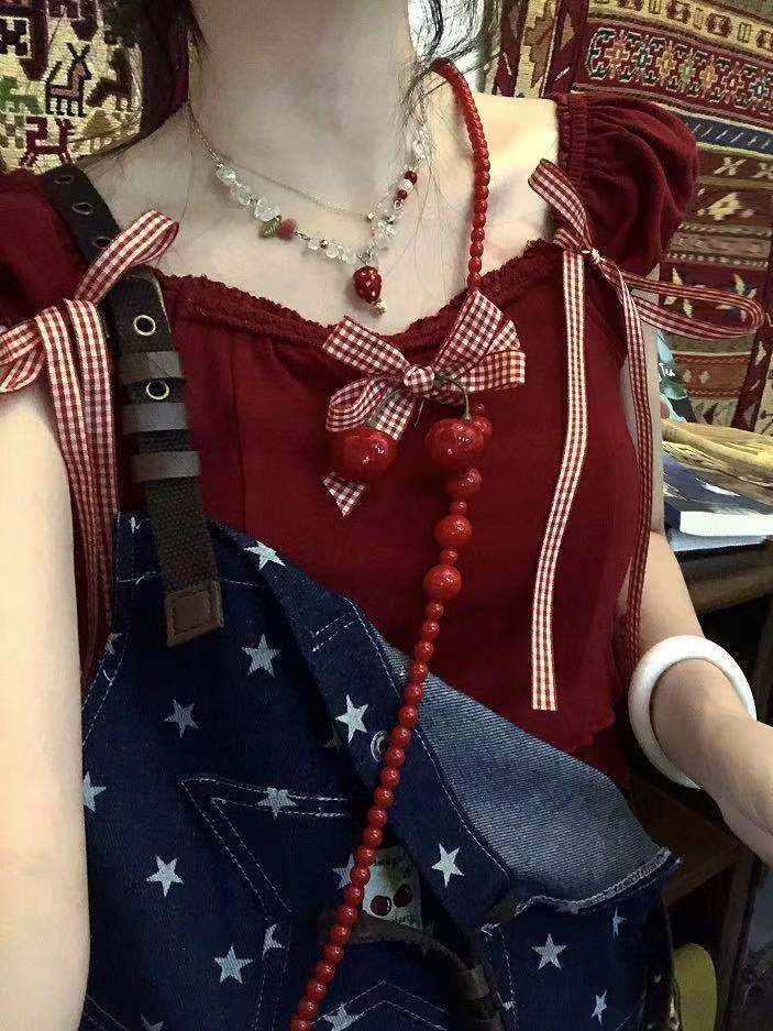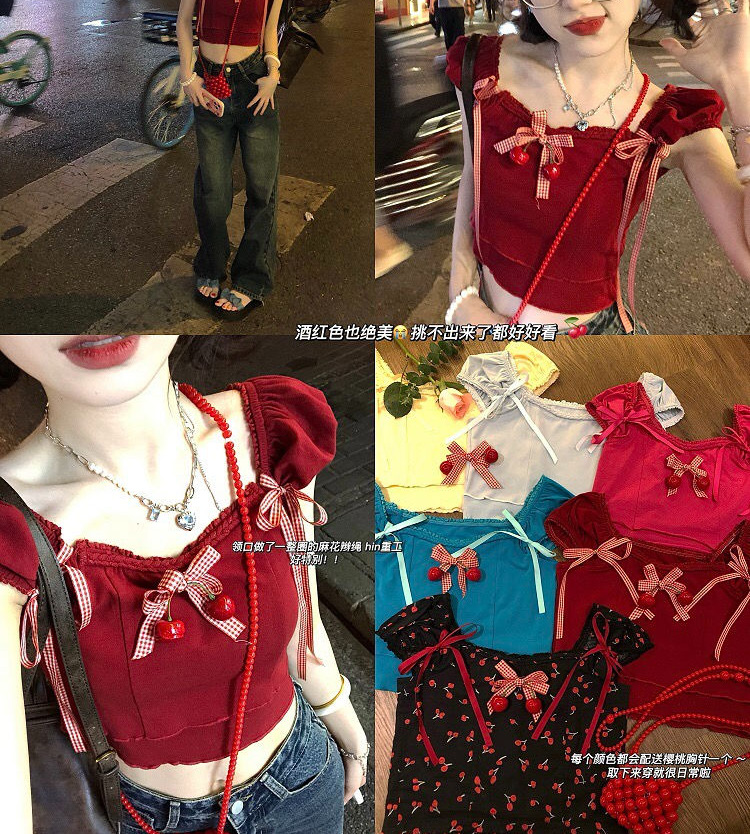 多巴胺编织绳蝴蝶结系带短上衣送樱桃胸针纯色T恤鬼马闺蜜装
