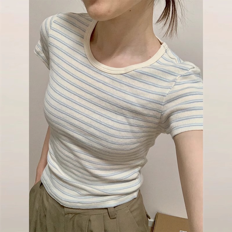 设计感小众条纹正肩短袖t恤女夏季小衫修身显瘦纯欲辣妹短款上衣