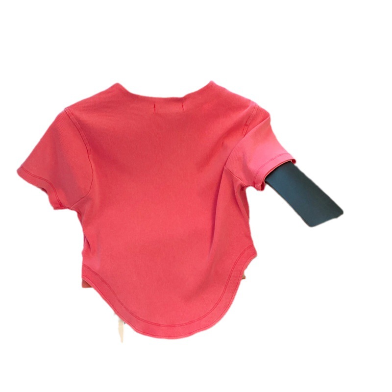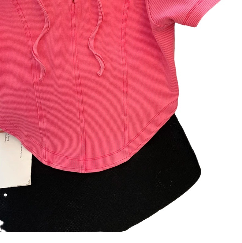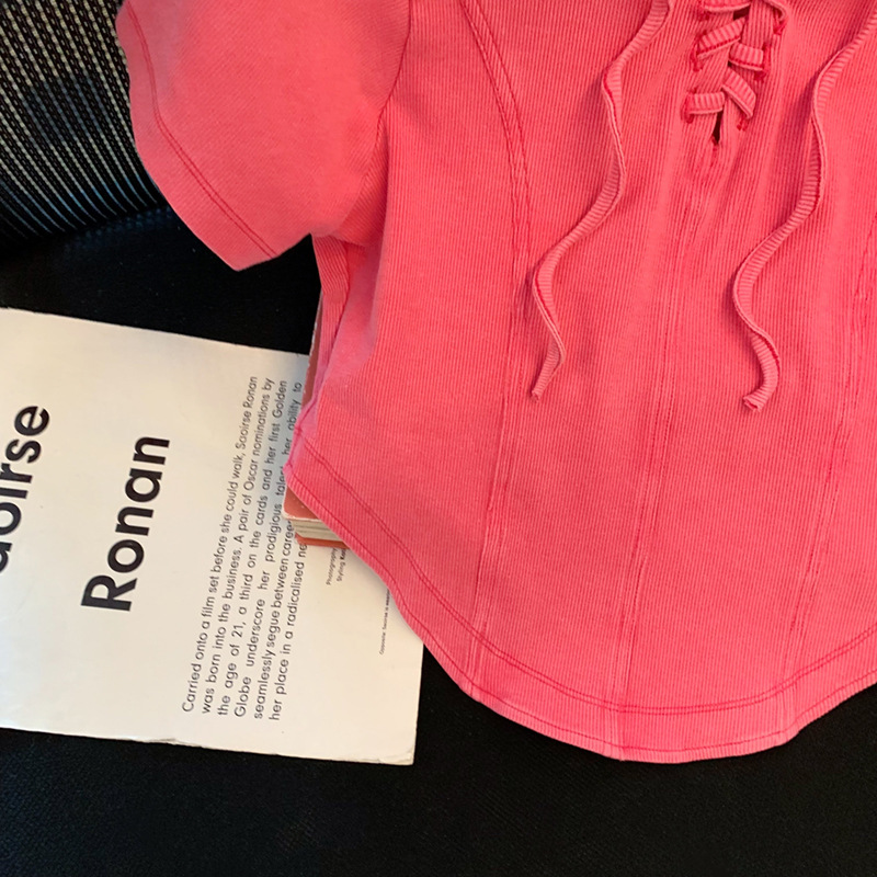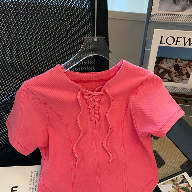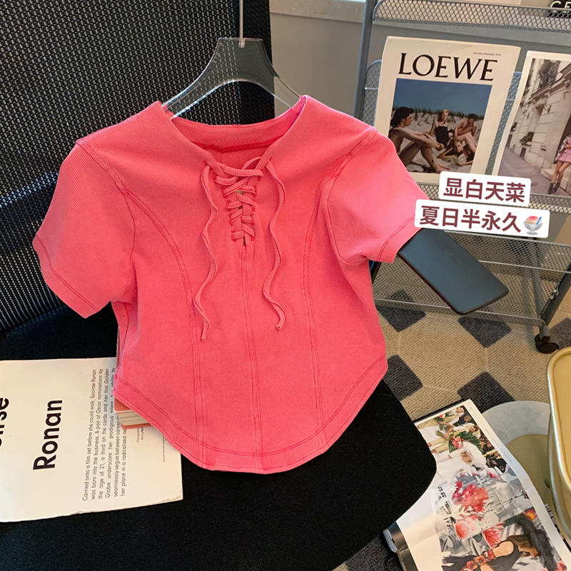 玫红色t恤女绑带短袖设计感小众夏季新款纯欲辣妹修身短上衣