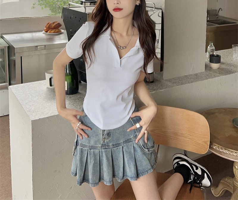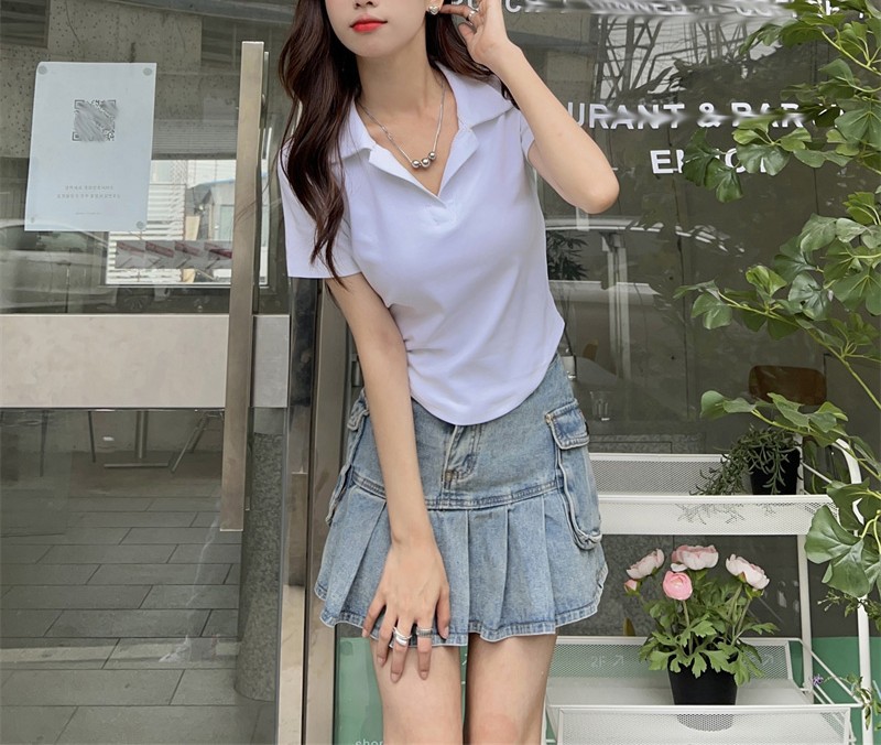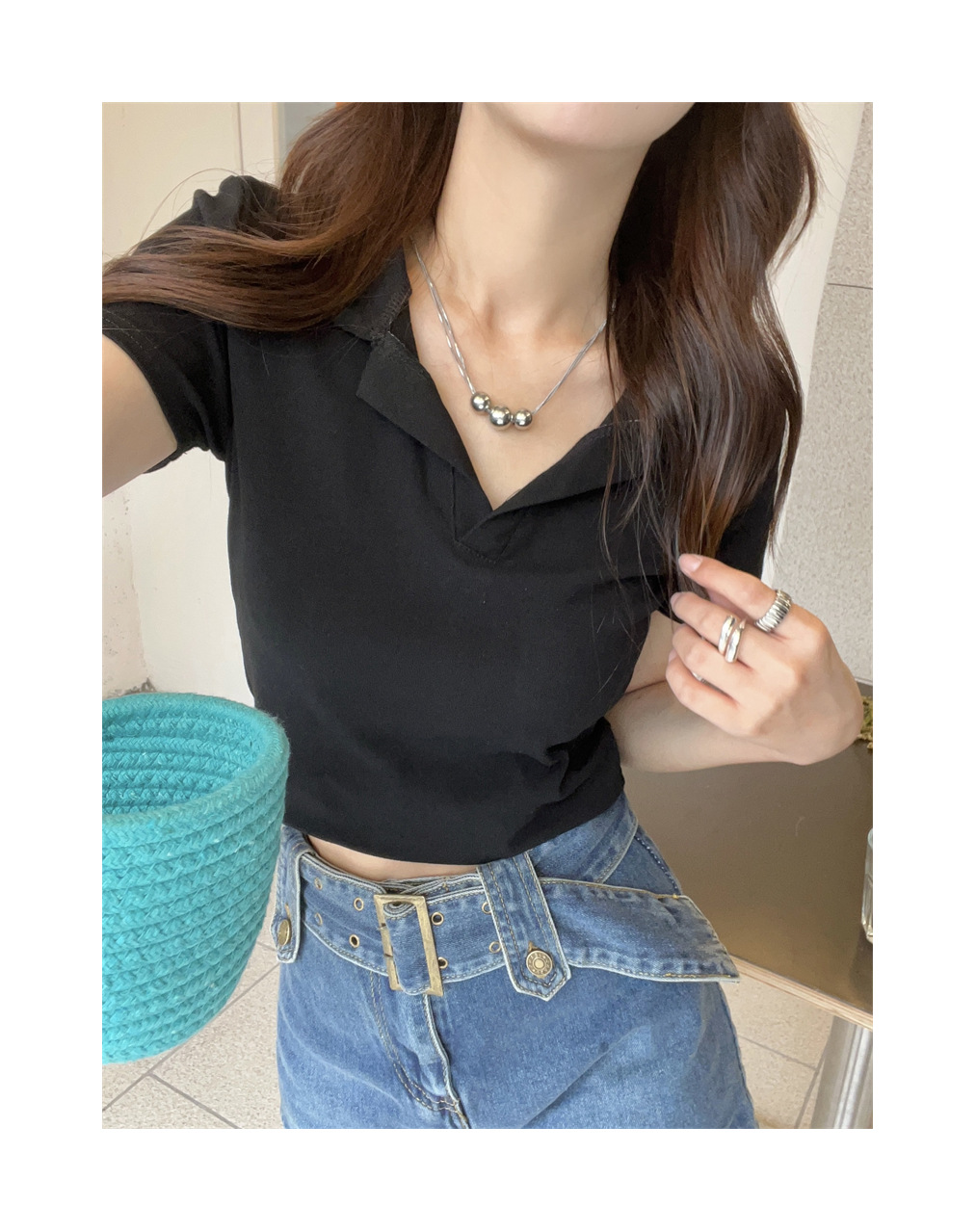 polo领正肩白色t恤女短袖夏季修身设计感别致短款鱼骨显瘦小上衣