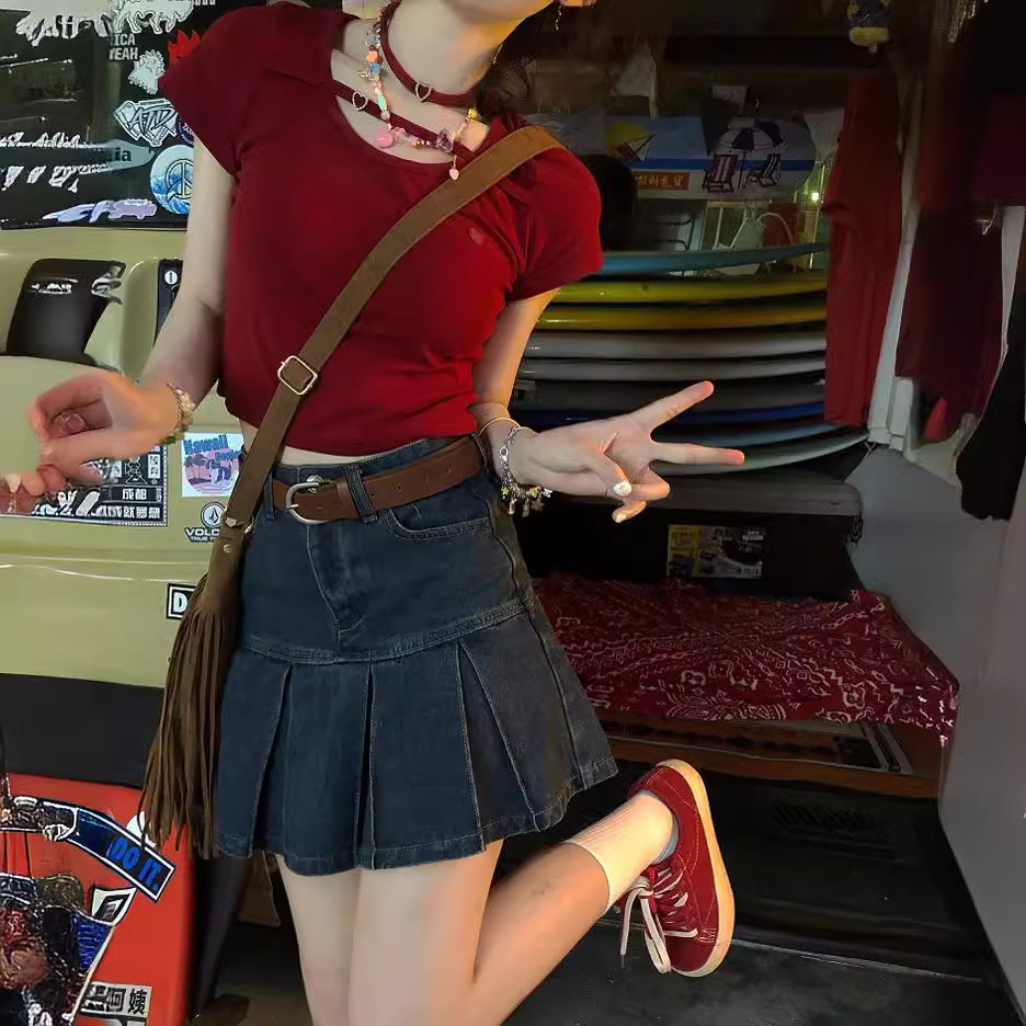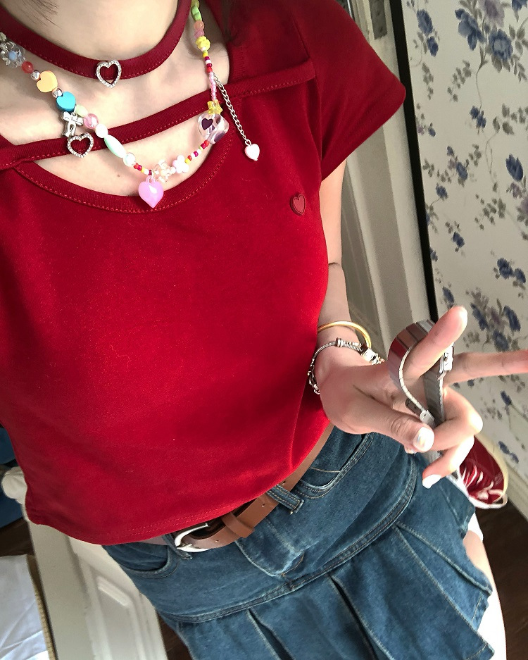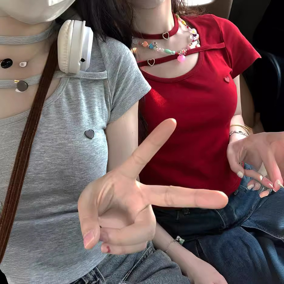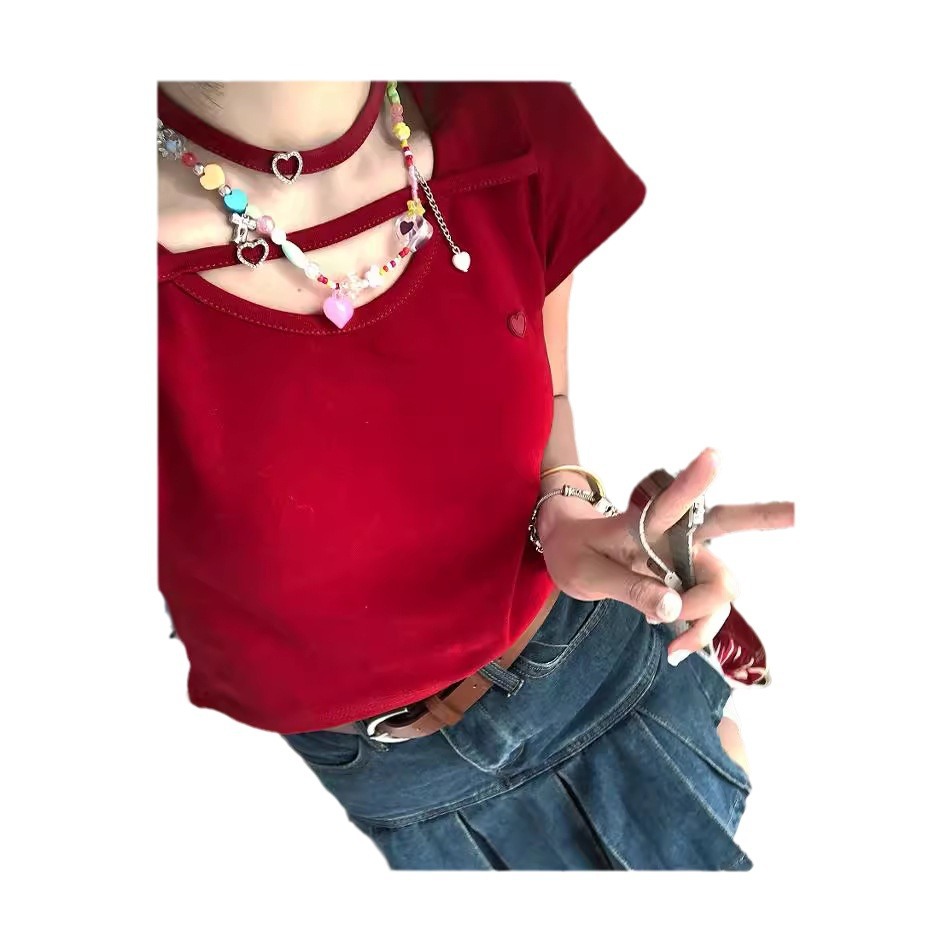 夏季新款学生多巴胺女孩爱心标设计感短上衣圆领正肩批发t恤短袖