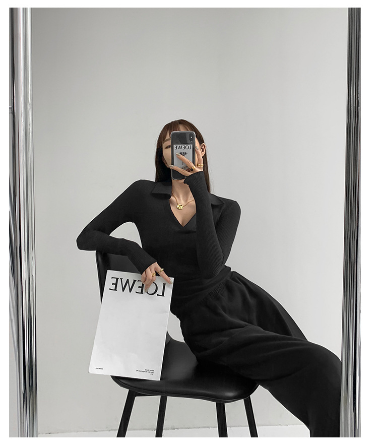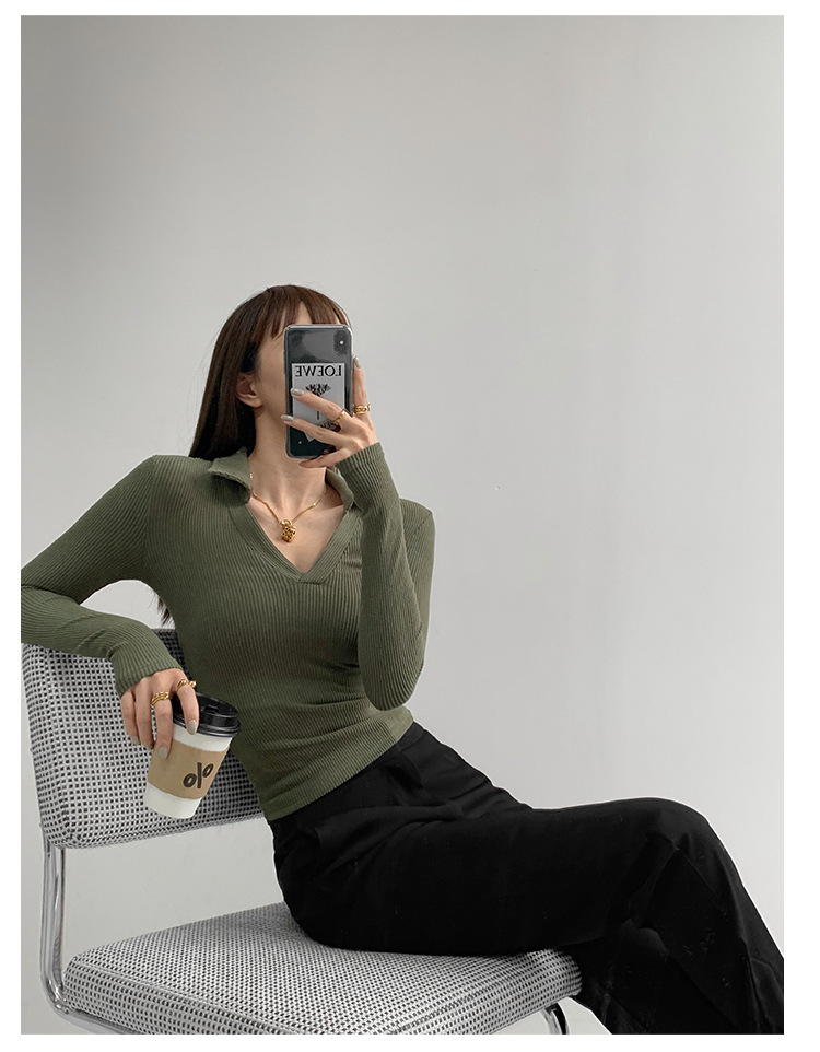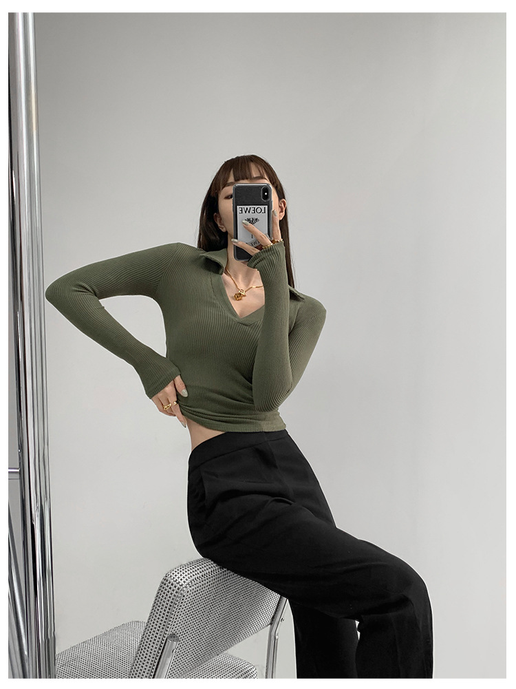 翻领长袖T恤女春秋新款韩版螺纹辣妹纯色修身时尚设计打底衫