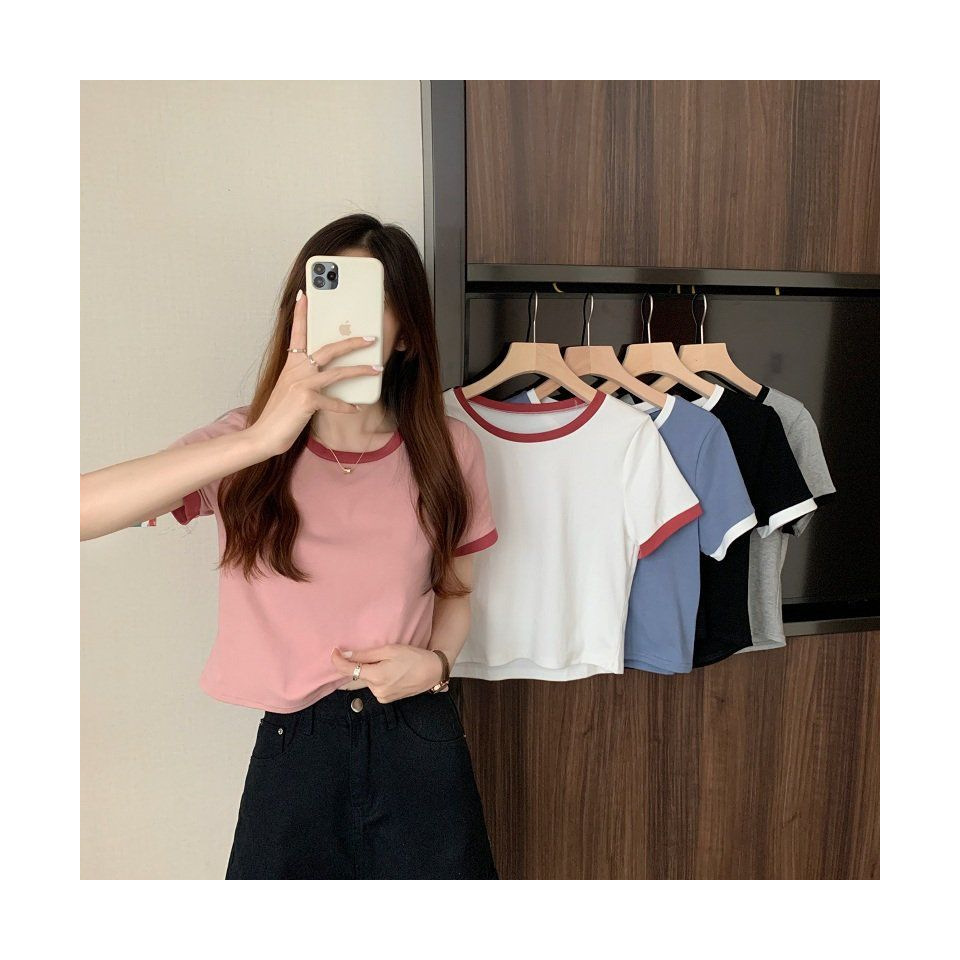撞色圆领短袖T恤女夏季新款学生打底衫韩版修身短款上衣韩式女装