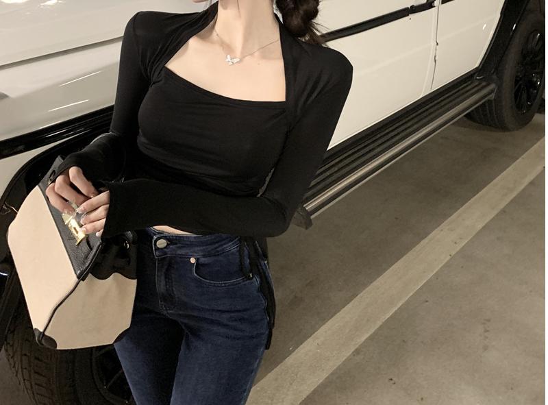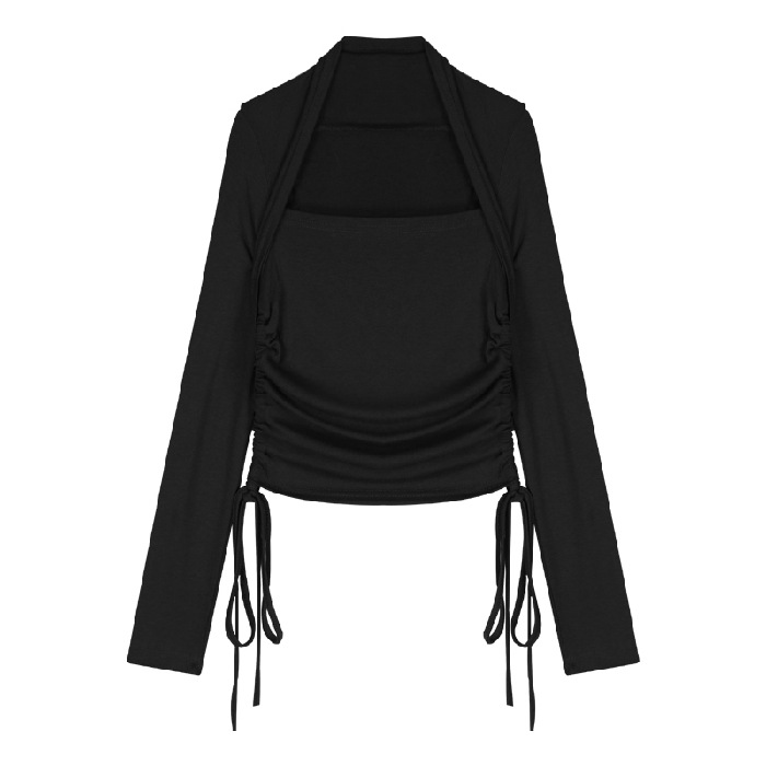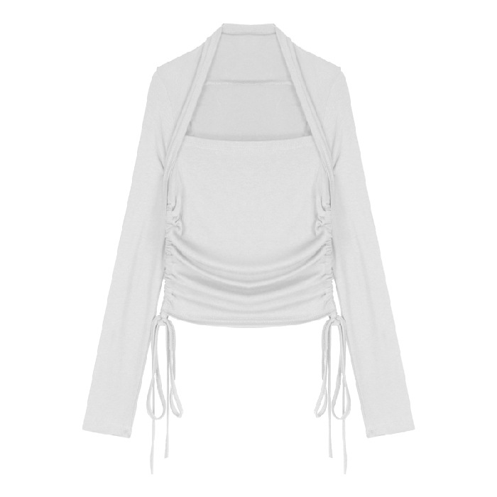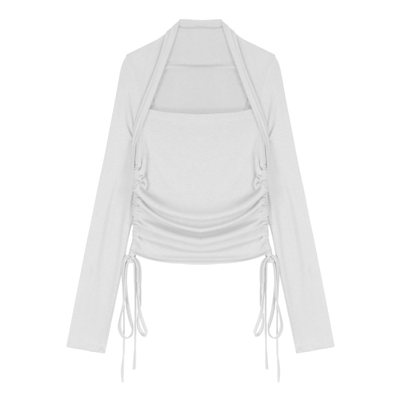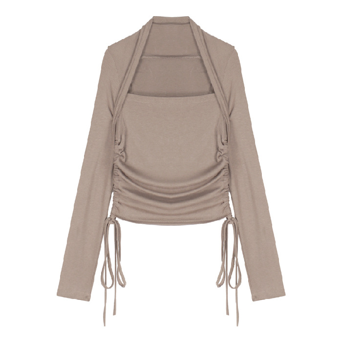 新款T恤女装方领纯欲辣妹紧身短款打底衫设计感别致抽绳长袖上衣