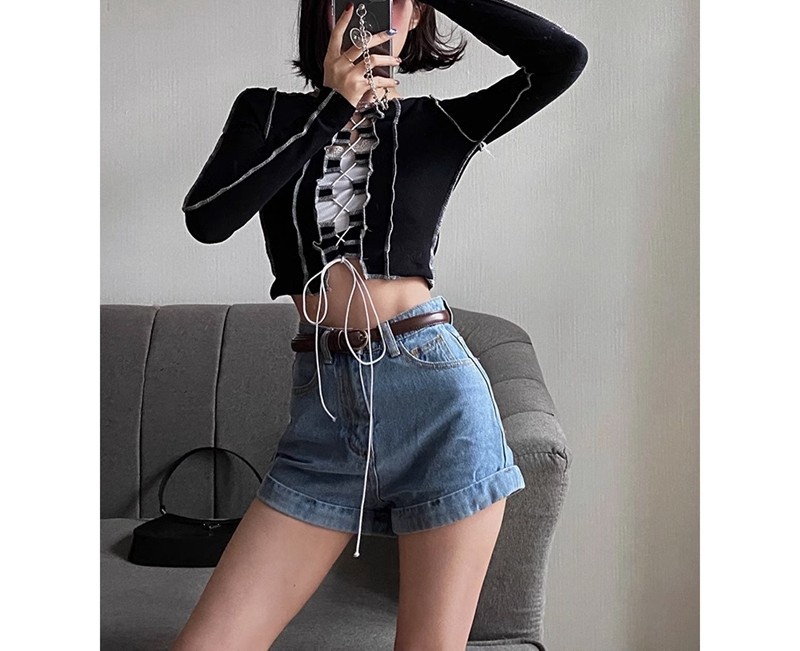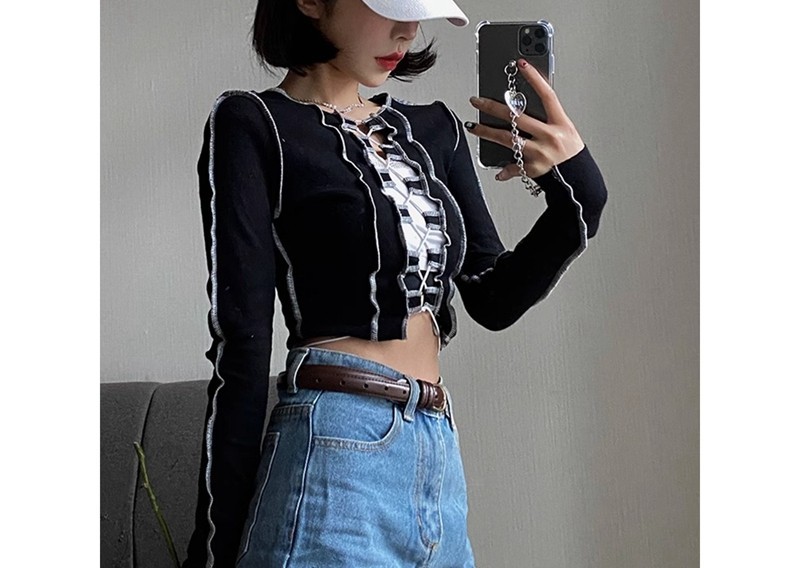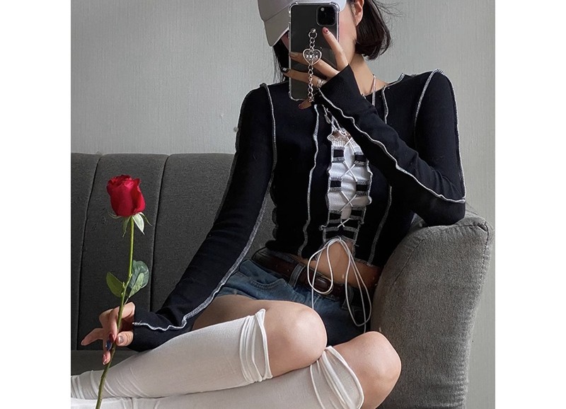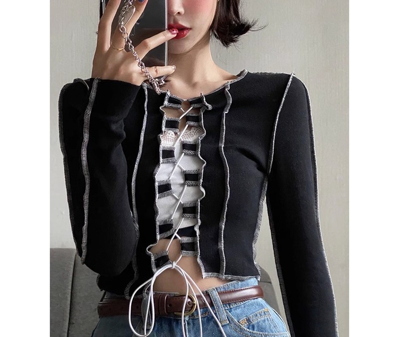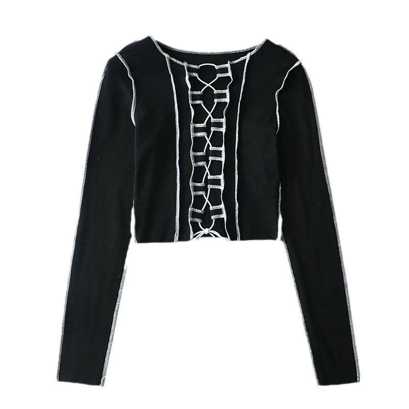 抽绳短款黑色小心机设计性感内搭春秋打底衫紧身长袖T恤辣妹女装