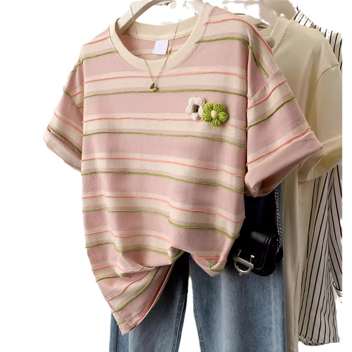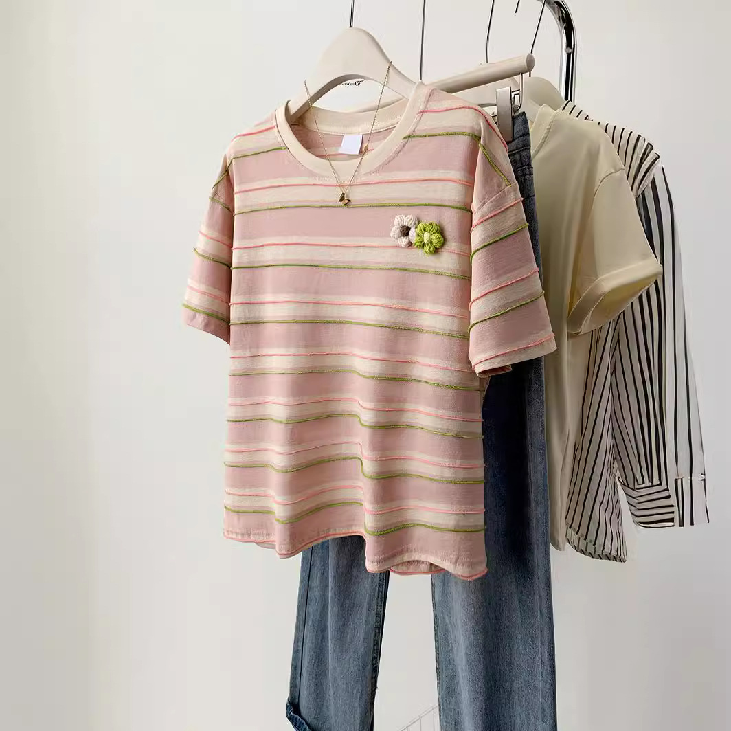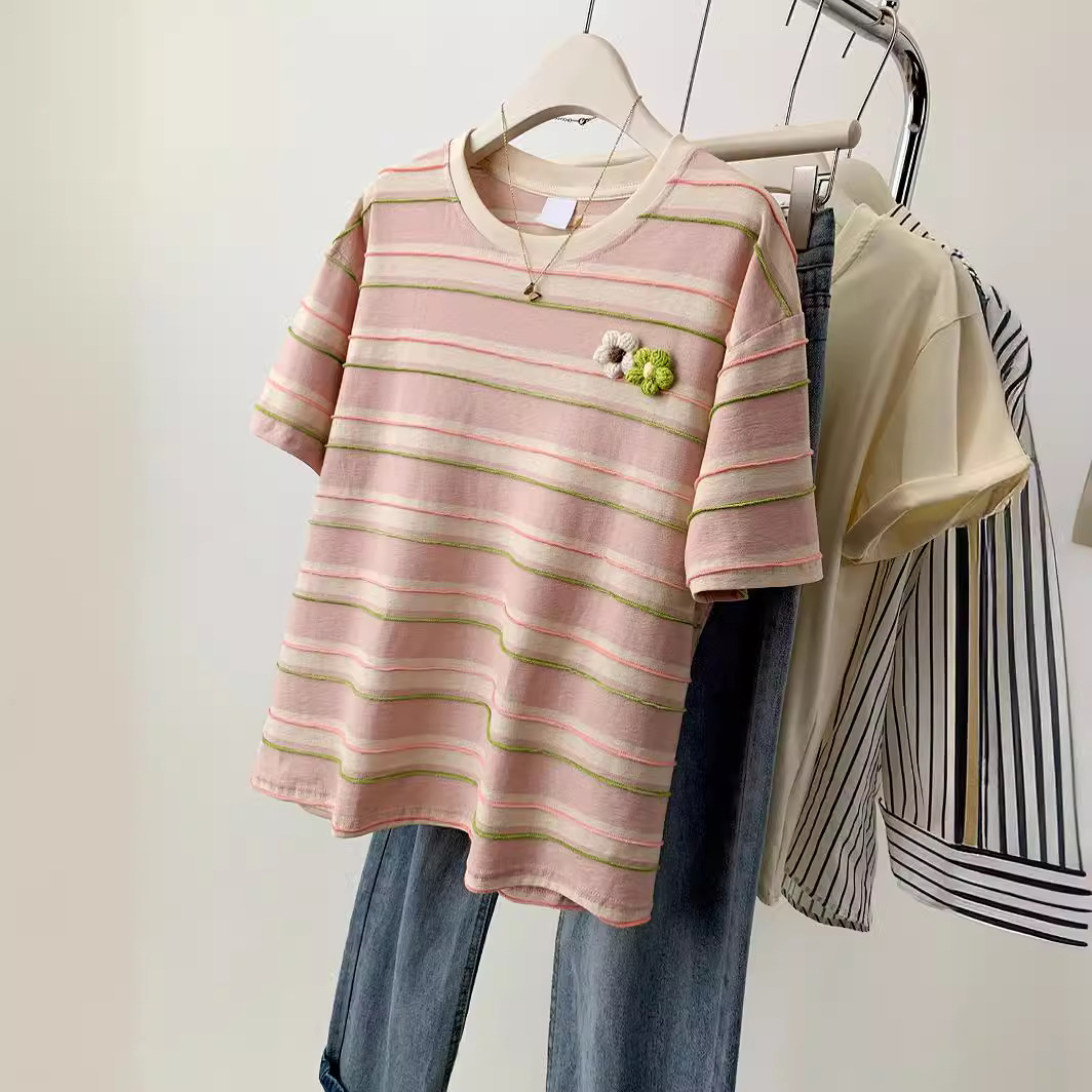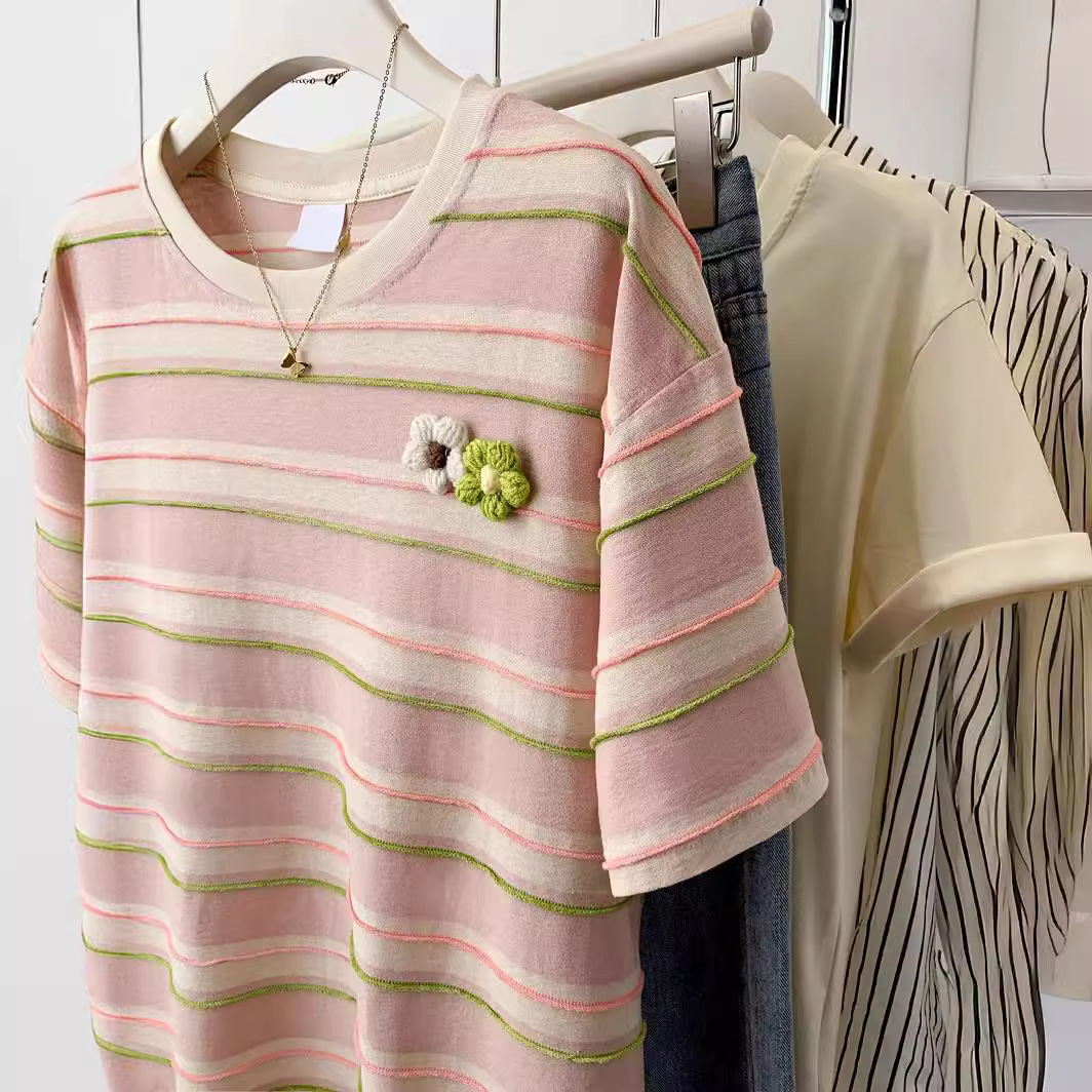 可拆卸装饰显瘦针织时尚休闲夏季条纹圆领洋气半袖复古短袖潮ins