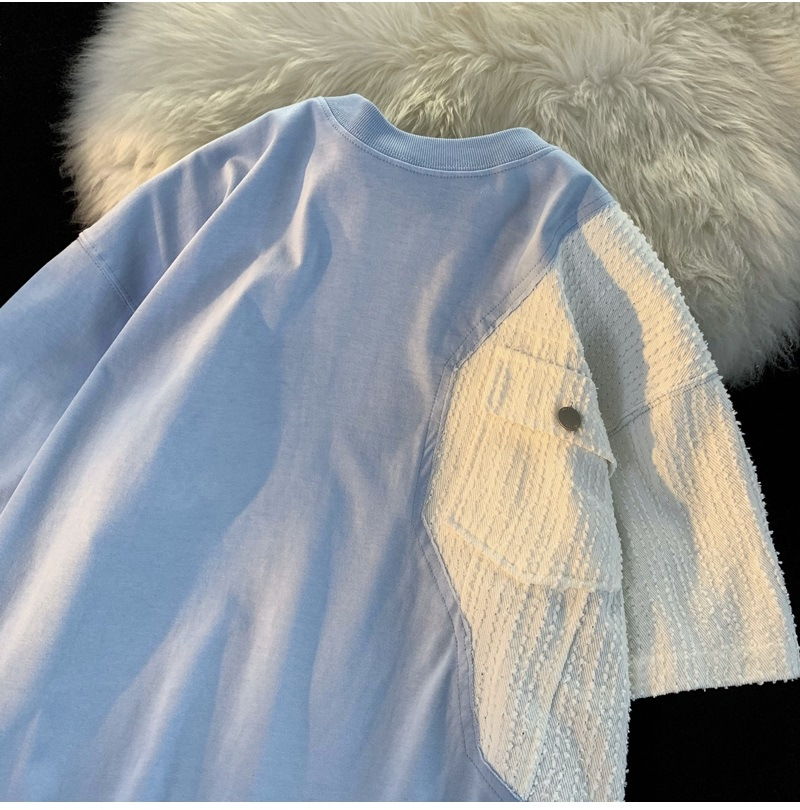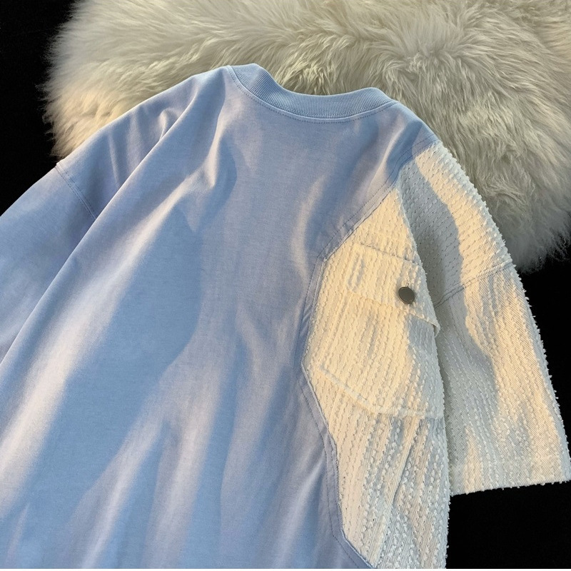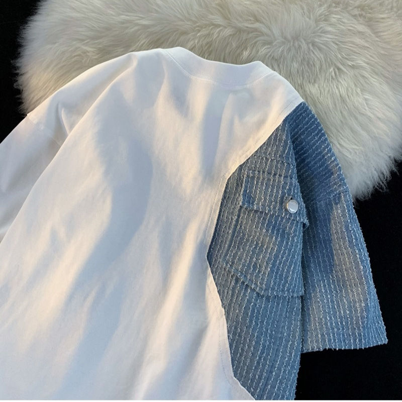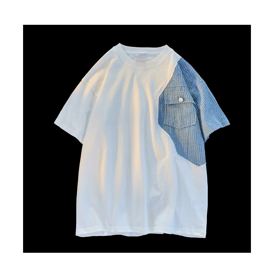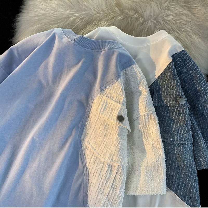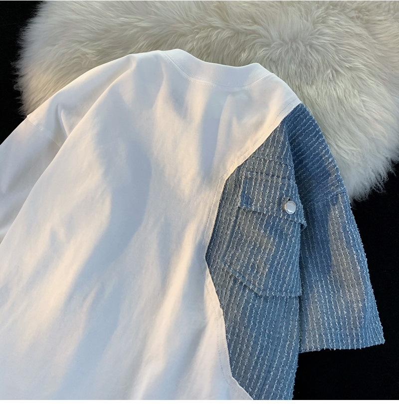 夏季新款半袖T恤男牛仔拼接设计感翻领短袖POLO领宽松休闲潮流t恤