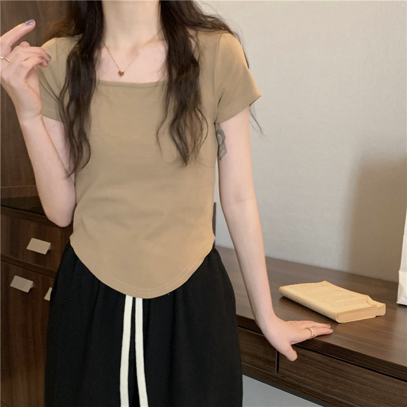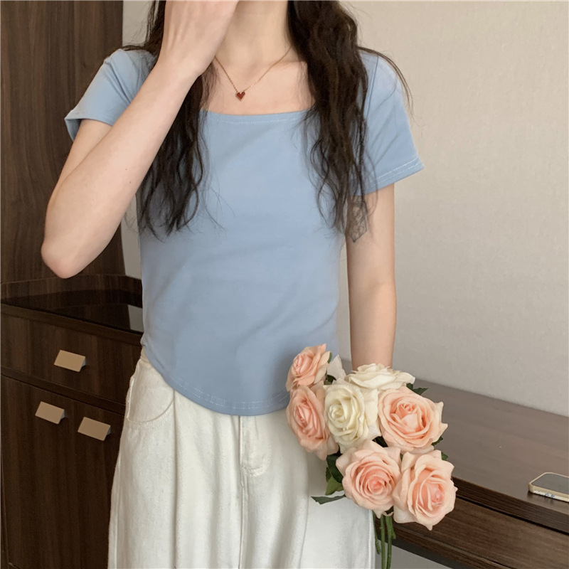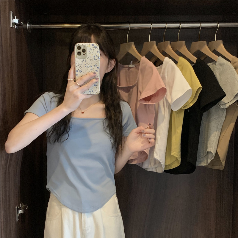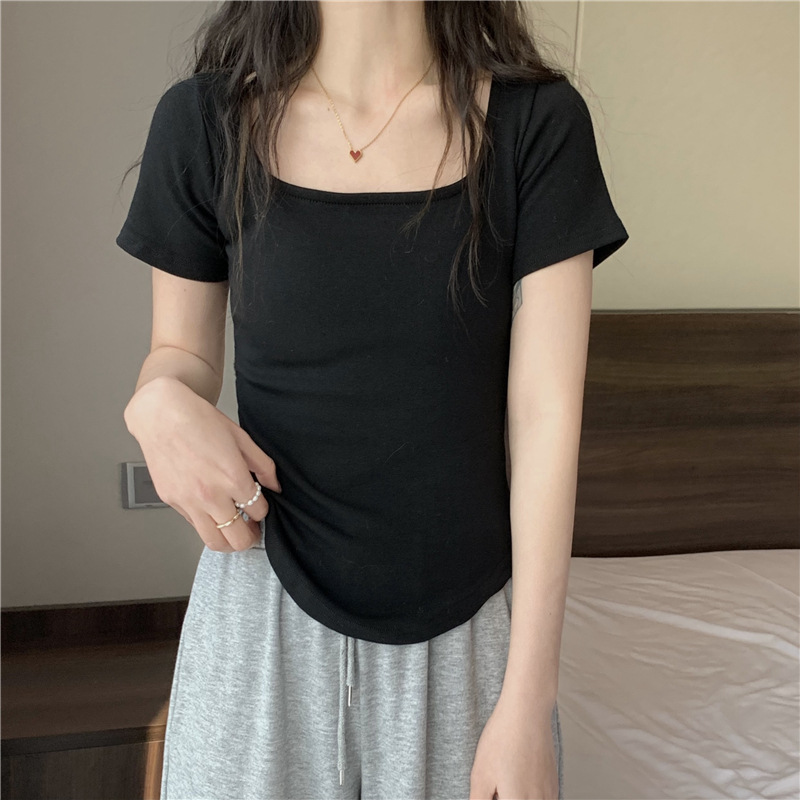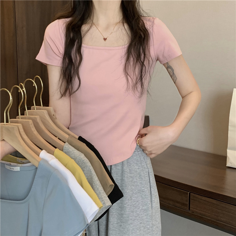 夏季新款修身内搭方领短袖t恤女高腰短款露脐打底衫上衣女装