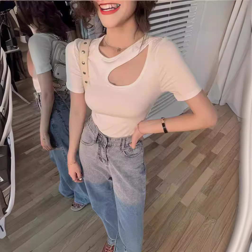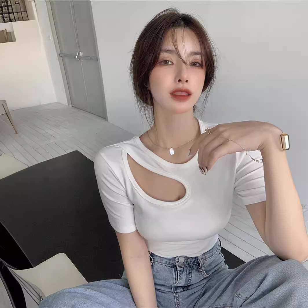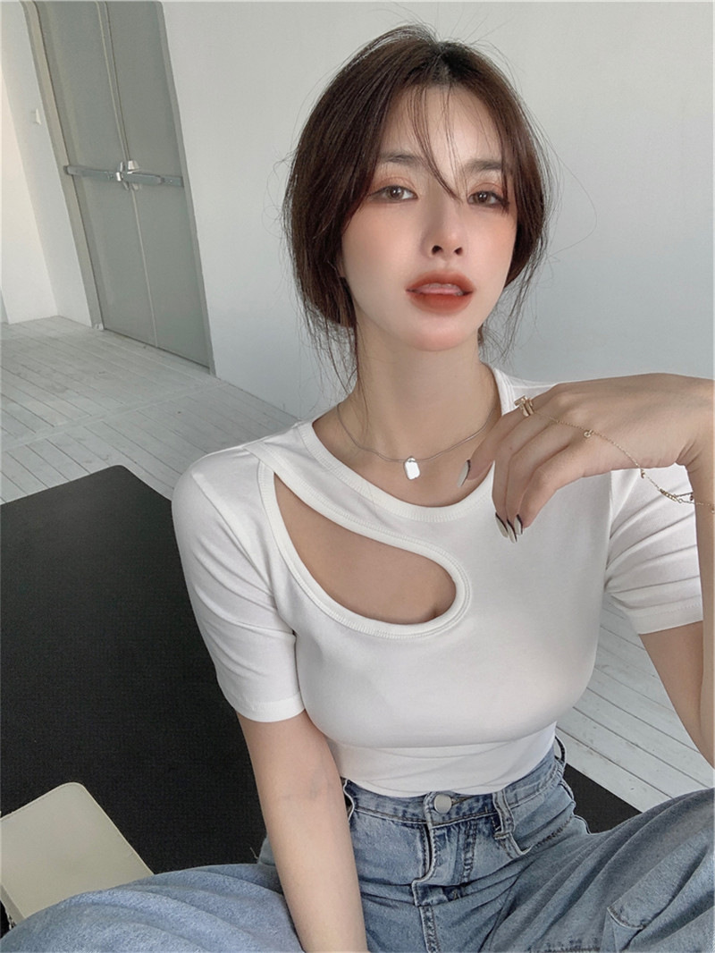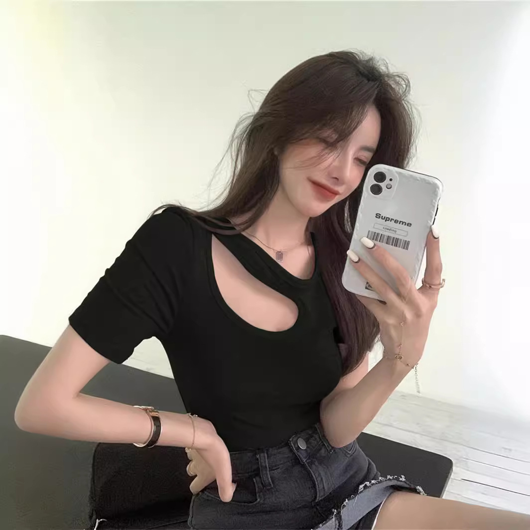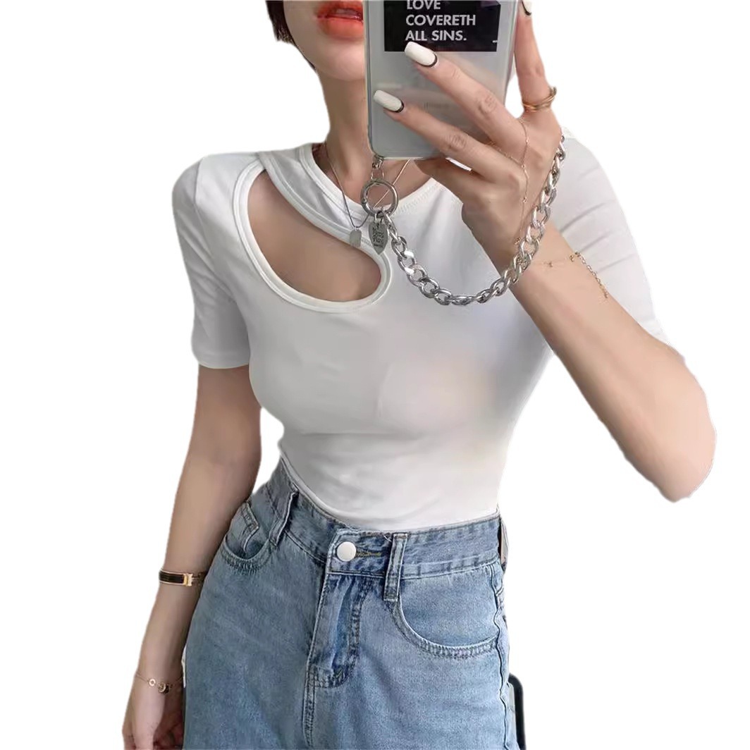 夏季修身辣妹显瘦T恤小众设计感纯色韩版潮流ins短款不规则镂空潮