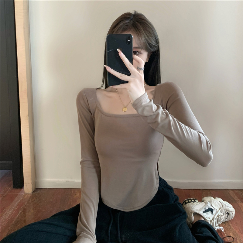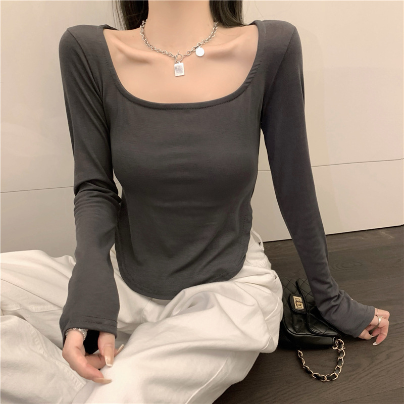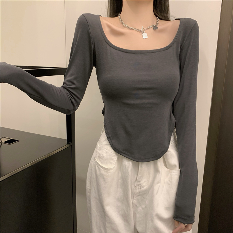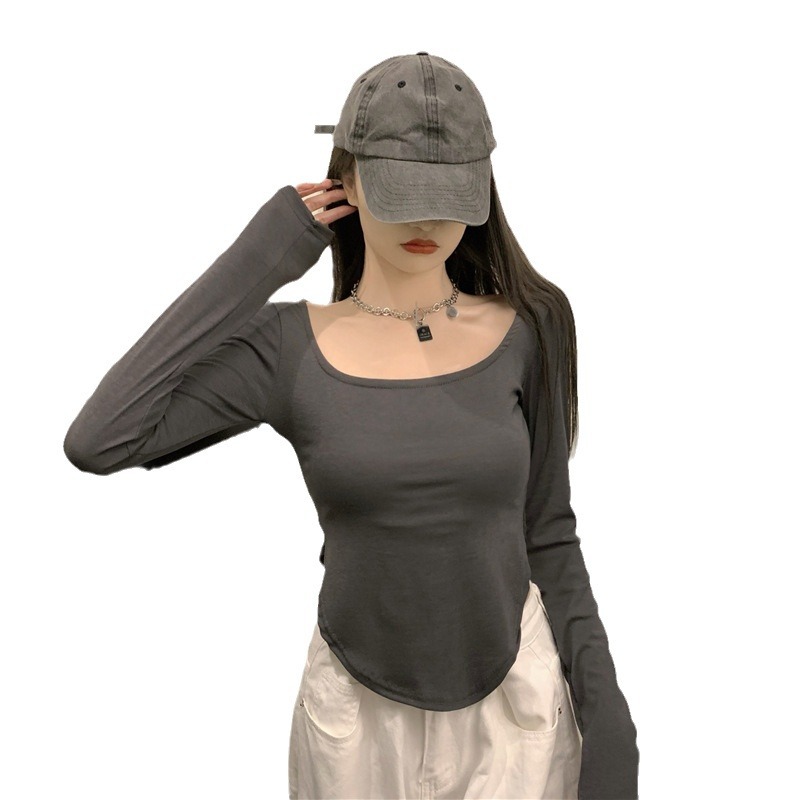 韩版打底衫显瘦长袖辣妹U型领性感不规则小众时尚潮流ins设计感