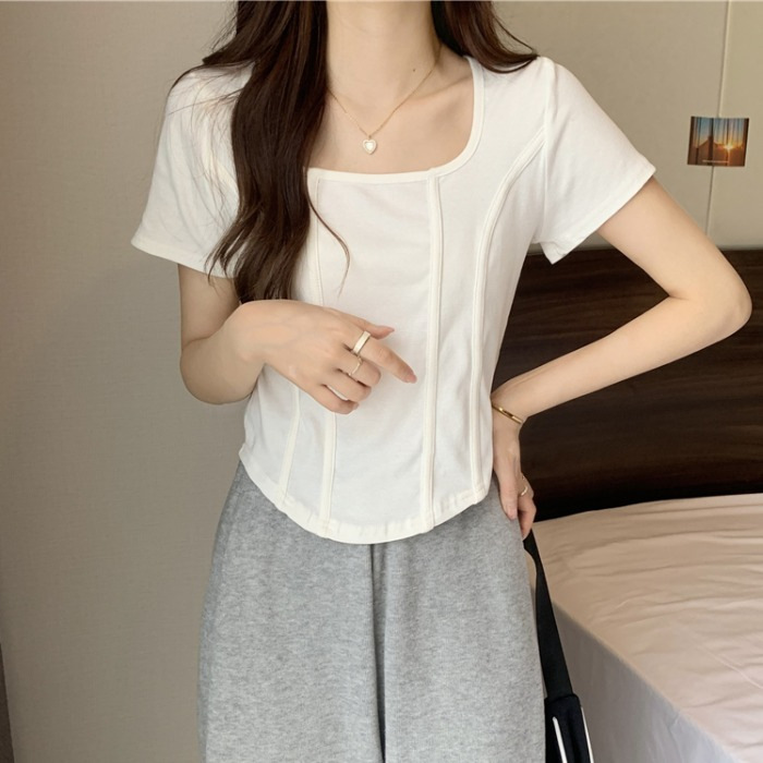 御姐炸街上衣显瘦白色短款夏不规则小众修身高腰纯欲抽绳方领T恤