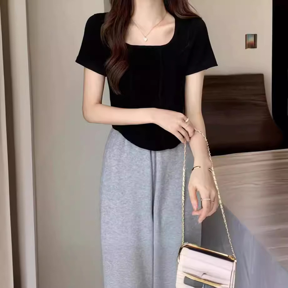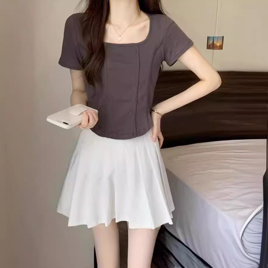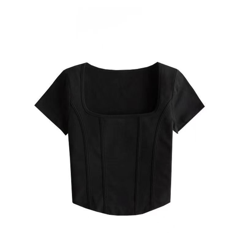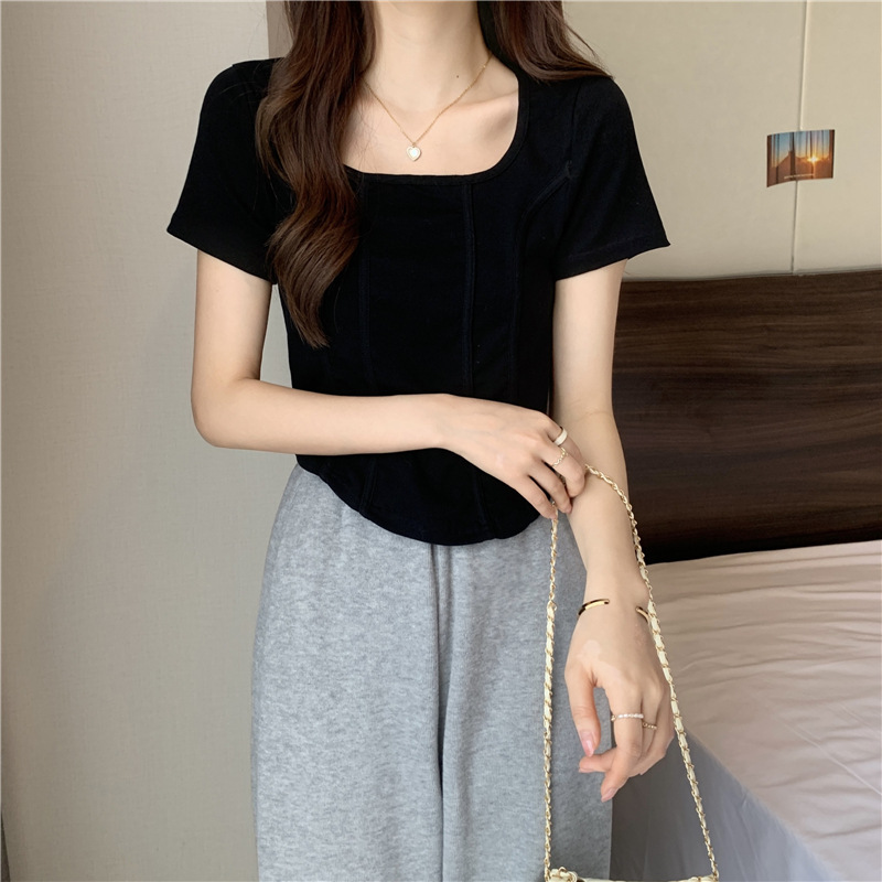纯欲风正肩u领短袖t恤女春夏新款小众设计感小个子纽扣上衣